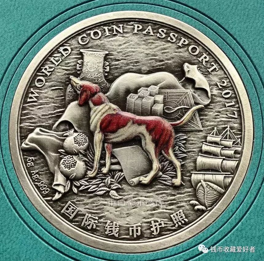 2017国际钱币护照的封面银章图案取材于早在古代“海上丝绸之路”时期就蜚声中外的中国丝绸、瓷器、茶叶和中国古代“四大发明”等元素。银章中央,一条栩栩如生的骏犬跃然其上,该骏犬原稿为清代宫廷著名画师郎世宁所绘,寓意北京国际钱币博览会是弘扬钱币文化,促进中西方钱币产品交融的理想平台。同时,又有中国传统生肖文化的韵味。