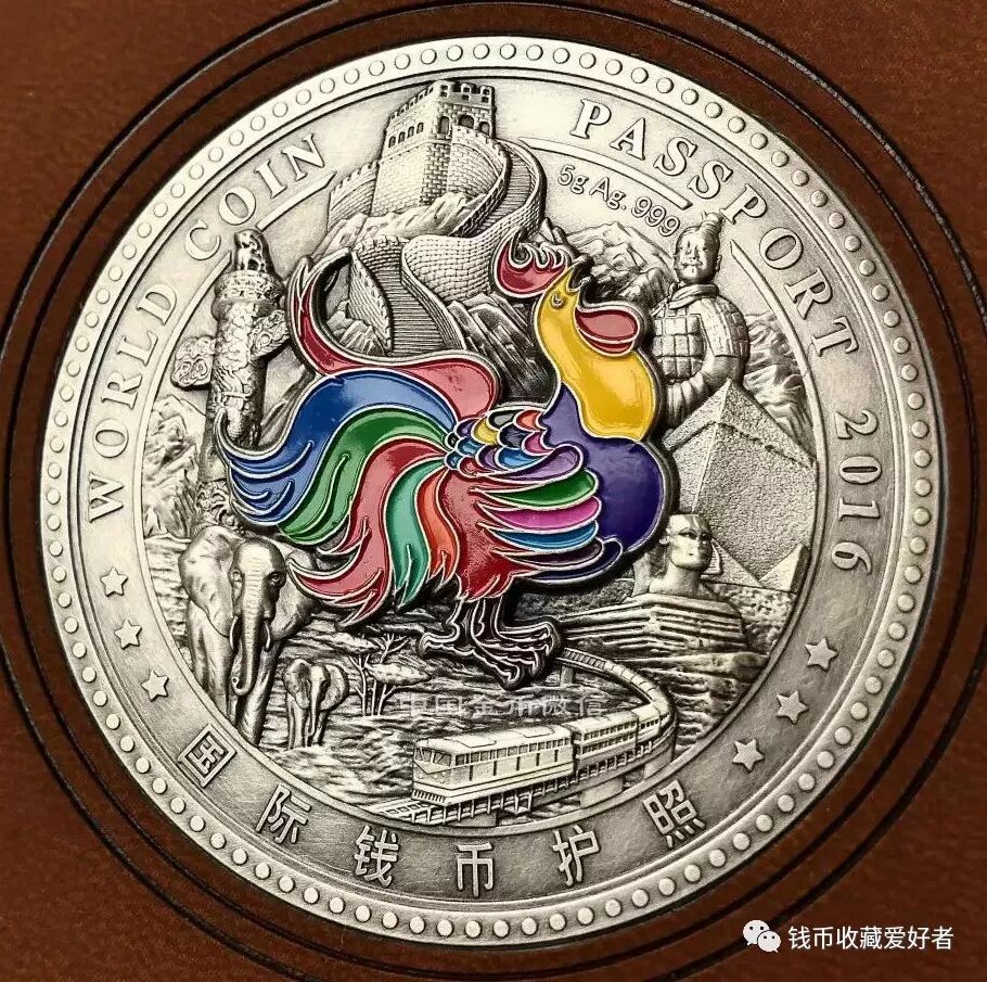 2016国际钱币护照的封面银质纪念章图案以“一带一路”和“南非中国年”为设计思路,采用高浮雕工艺在背景深处刻画了中国万里长城、兵马俑及华表,纵贯长城绵延到前景处的则是非洲象、金字塔、狮身人面像以及坦赞铁路上驶向未来的列车。珐琅彩工艺刻画的五彩雄鸡,既象征着中国地图,又与中国生肖鸡年息息相关。