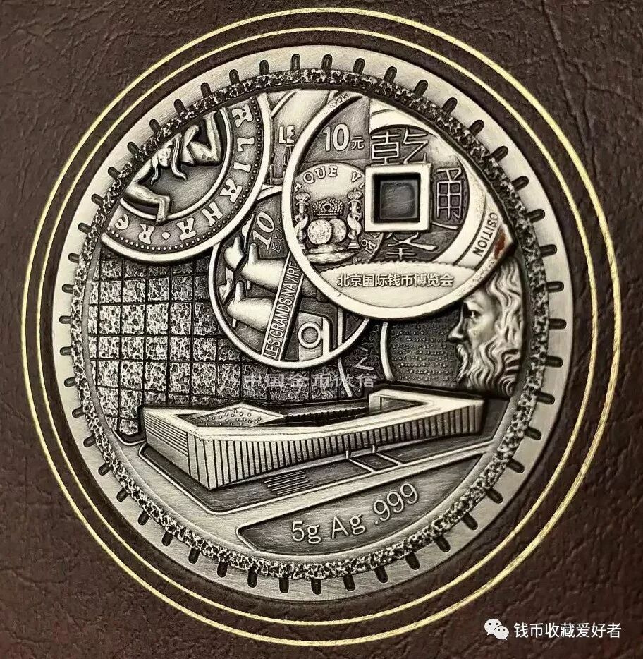 2014国际钱币护照的封面镶嵌圆形纯银纪念章,采用浮雕做旧的铸币工艺,由成色99.9%的5克纯银铸造而成。纪念章图案以国家会议中心鸟瞰图为背景,巧妙地将2014北京国际钱币博览会银质纪念币和部分国外硬币交错叠放在其上方,寓意北京国际钱币博览会是弘扬世界钱币文化的理想舞台。