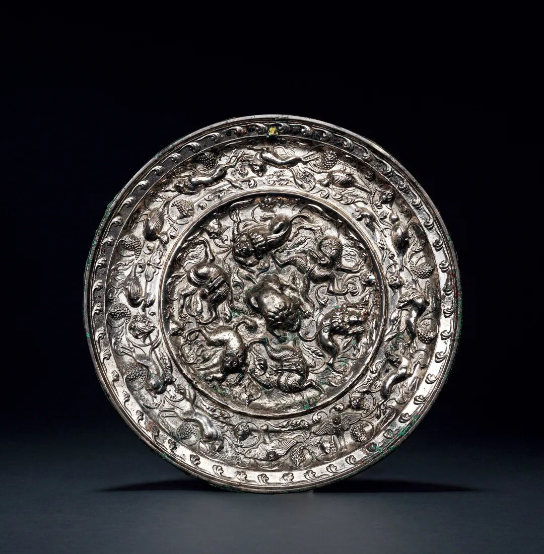 瑞獸葡萄的造型是唐代中期極為流行的一種銅鏡紋飾,這種繁縟富麗、花團錦簇的裝飾風格充分體現了盛唐時期的富裕繁榮以及多民族文化的相互交融。此面銅鏡鑄造極為精緻,六隻瑞獸或追逐玩耍,或回首凝望,或匍匐潛行,或仰面朝天,神態各異,細緻生動。