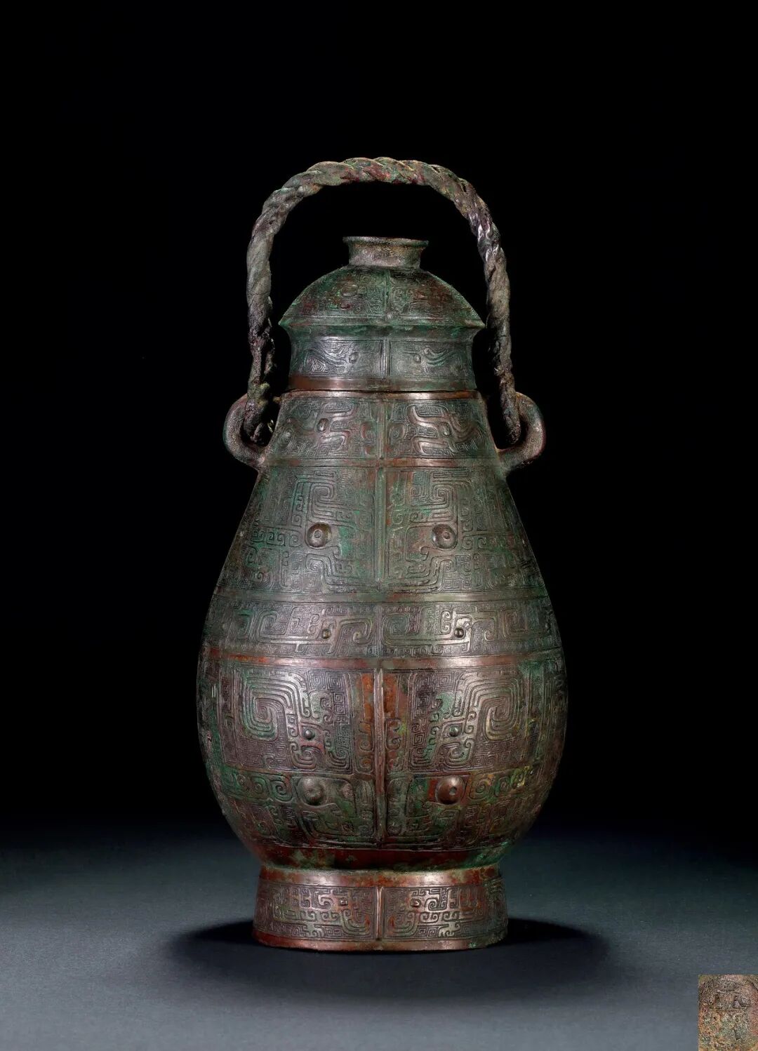 青銅卣是商周青銅器中比較重要的盛酒器之一,常出於規格比較高的墓葬之中。這件提梁卣造型少見,鑄造規整精良,紋飾精美華麗且立體感極強。蓋頂銘文:「天黿」。有天黽銘文的器物歷代雖皆有記載,但有出土地可查的僅有兩件,一件出土於殷墟的商晚期青銅爵;一件出土於陝西乾縣,藏於台北故宮博物院的西周獻侯鼎。存世天黽器製作皆精美大氣,不論如何隸定銘文,此族在商末之西周早期頗為顯赫當為學者的共識。