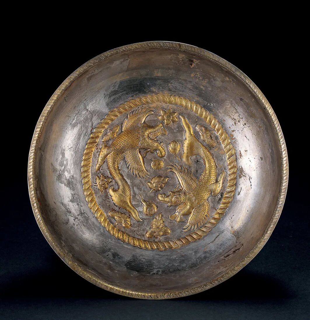 唐 銀錘鍱局部鎏金魚化龍紋碗