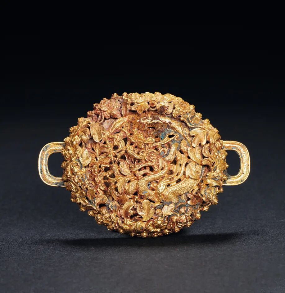 秦或西漢 銅鎏金鎏銀鏤空雙螭龍蓋爐