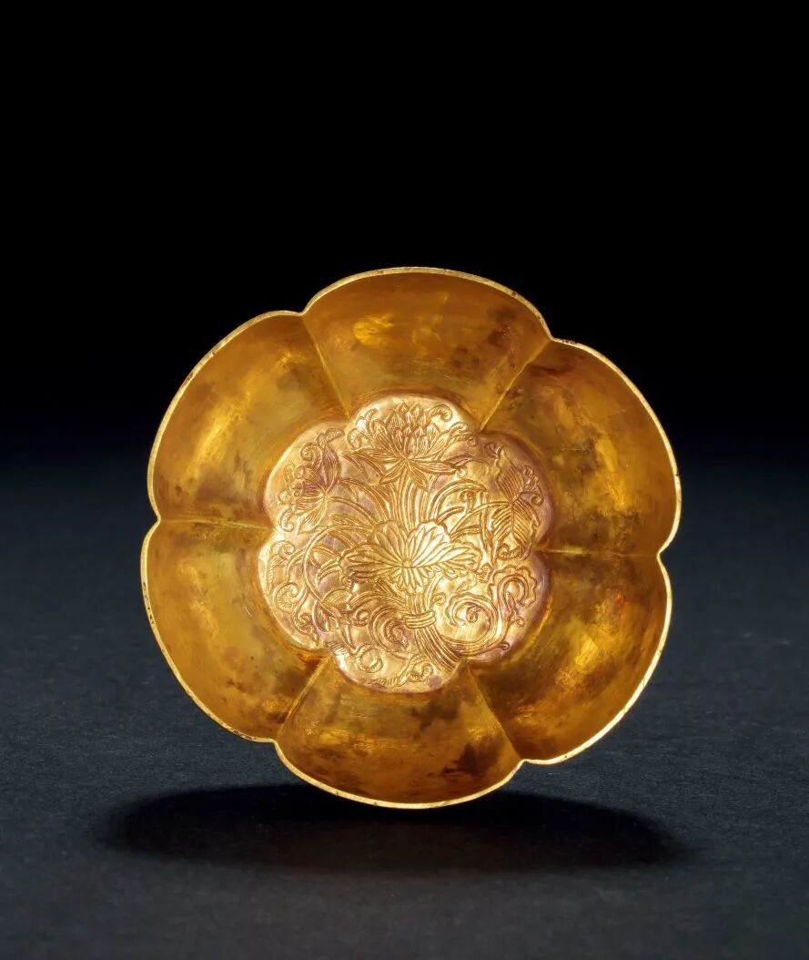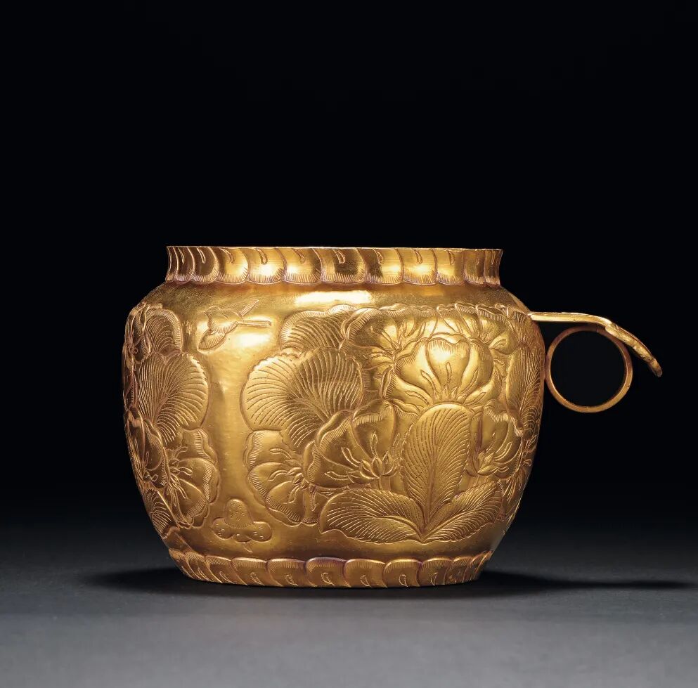 本品以金為材,表面呈明亮的金黃色,整器經錘鍱而成,杯子輕巧,器身及底部皆是一層薄金片。牡丹紋飾豐滿繁茂,回旋流暢,花鳥間呼應和諧,結構上疏密相宜,牡丹花之花狀、花瓣、苞蕾、枝葉乃至脈絡刻劃精細,整器造型繁而不亂。