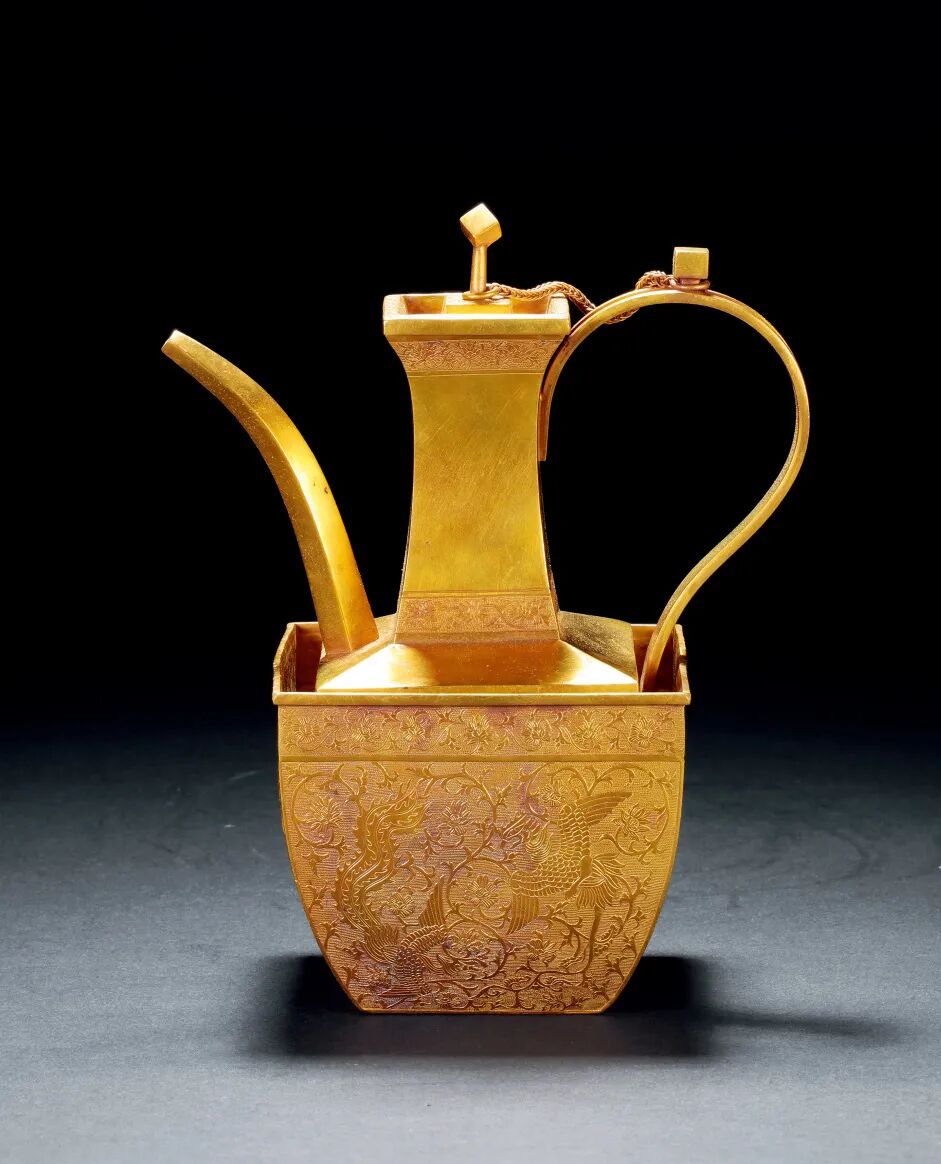 本品用材講究,細節完美,華麗異常,代表了宋代貴族最高審美。執壺與溫碗純金打造,執壺執線條挺直,亭亭玉立,簡潔挺拔,素雅潔淨、不失華貴之美。溫碗外撇上大下小,四面鏨刻鳳凰穿花紋,所飾纏枝牡丹的藤蔓卷草連續不斷,委婉多姿,富有動感,優美生動,寓有「生生不息」之意。