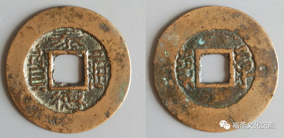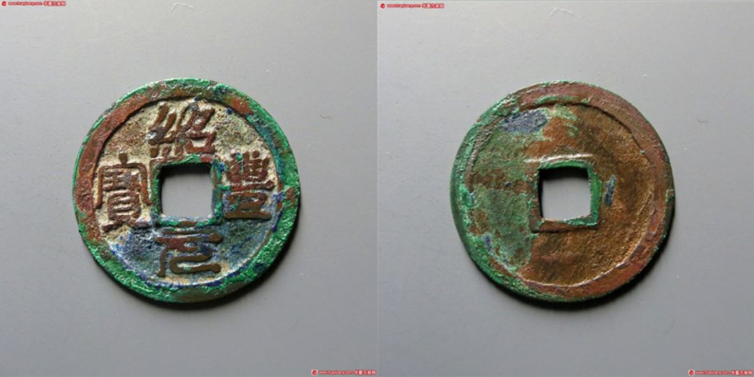 元丰通宝陈朝太宗元丰年间(1251—1357年)铸,时值南宋淳祐至宝祐间。面文“元丰通宝”篆书,旋读,为安南最早之仿宋篆书钱。径不足2.4厘米,光背无文。与宋元丰不同处在于:此钱边郭较阔,字体肥拙;“通”字明显隶化,走之末笔长而上翘,俗称“虎尾元丰”,另,钱体亦较宋元丰轻薄,稍加注意即不难辨别。唯安南“虎尾元丰”欲求颇难,世间遂不乏伪作赝品。