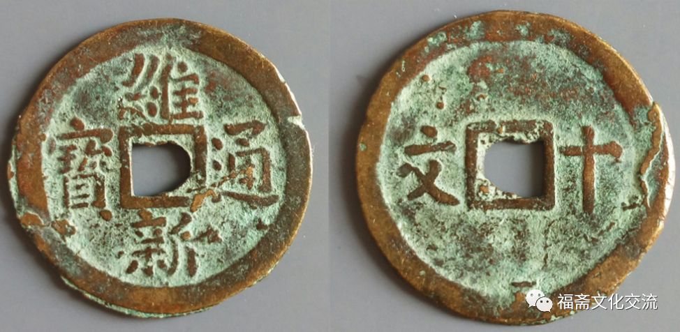 维新通宝阮朝维新帝阮福晃维新年间(1907—1915年)铸,时值清末民初。此钱形同成泰通宝,有大小二种。面文“维新通宝”楷书,直读,小钱多光背,大钱背铭“十文”二字,径约2.6厘米,维新钱制作粗陋,字廓平浅。