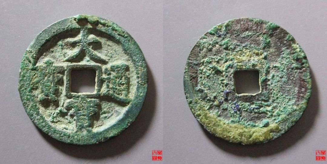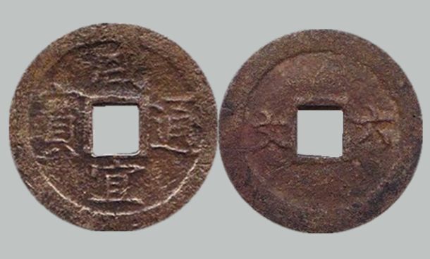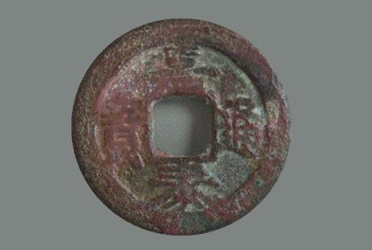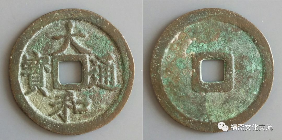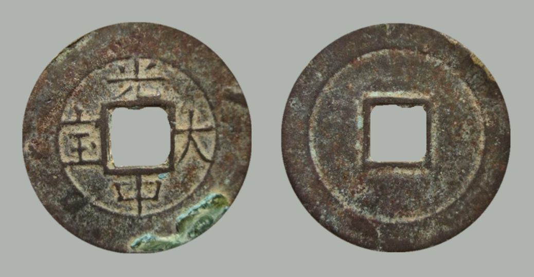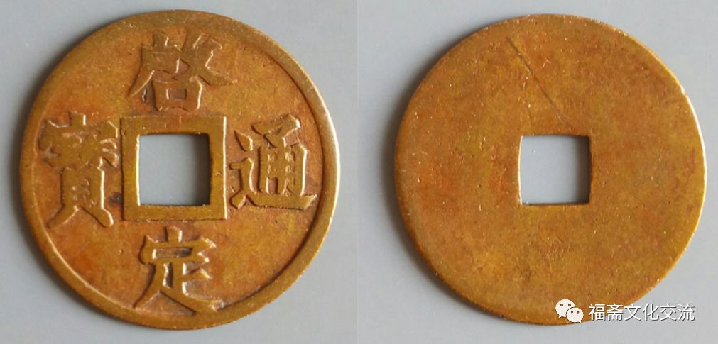 大定通宝安南陈朝废帝杨日礼大定元年(1369年)铸,时值明洪武二年。面文“大定通宝”楷书,直读,文笔粗壮笨拙,光背无文,径约2.4厘米。此钱在安南钱中品相中等,铸量稍丰,然观其形制特点与文字风格,与金代瘦金体大定通宝则迥然有别,其精其美,差之甚远,泾渭分明,鉴别时当不难分辨。