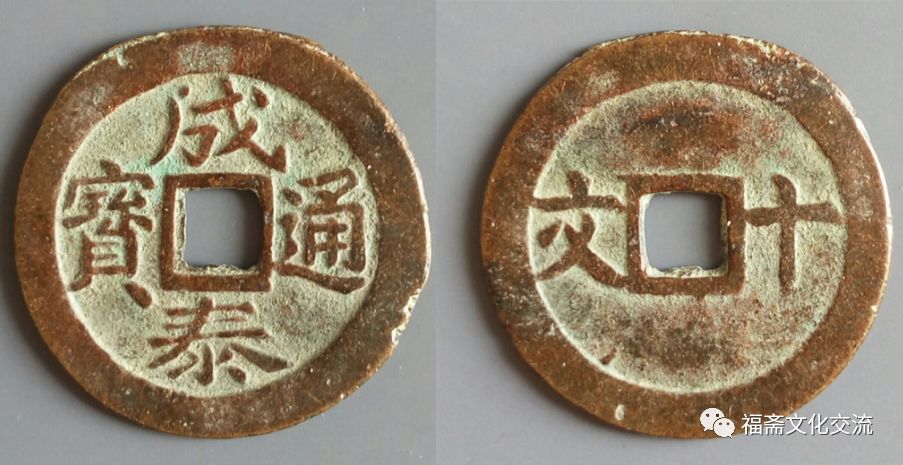 成泰通宝阮朝成泰帝阮福昭成泰年间(1889—1906年)铸,时当清光绪中后期。此钱有大小二种.面文“成泰通宝”楷书,直读,笔法有清钱风韵。小钱往约2.3厘米,分光背及背“六文”两品。大钱径约2.6厘米,背铸“十文”二字,其存世较小钱为多。