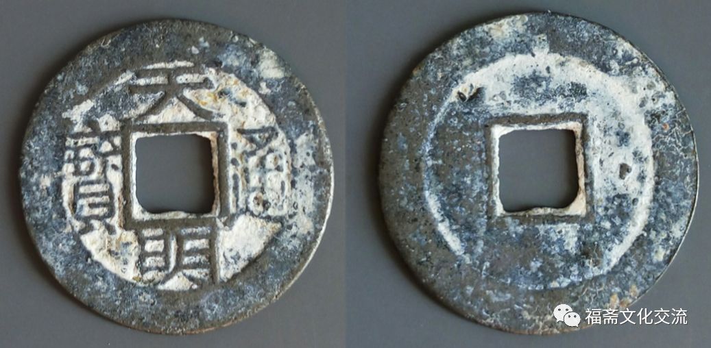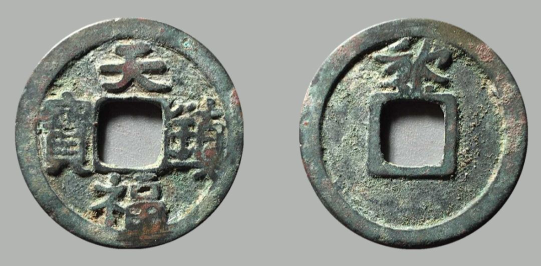 天福镇宝安南前黎朝黎桓灭丁朝自立,改元天福,并于天福五年(984年,宋雍熙元年)铸行天福镇宝钱。形制及文字风格与太平兴宝相类。径2.4厘米,重约3.2克。面文楷书直读,字体淳朴粗壮,背穿上铭一“黎”字以记朝代,俗称“黎字钱”。亦有极少光背者。