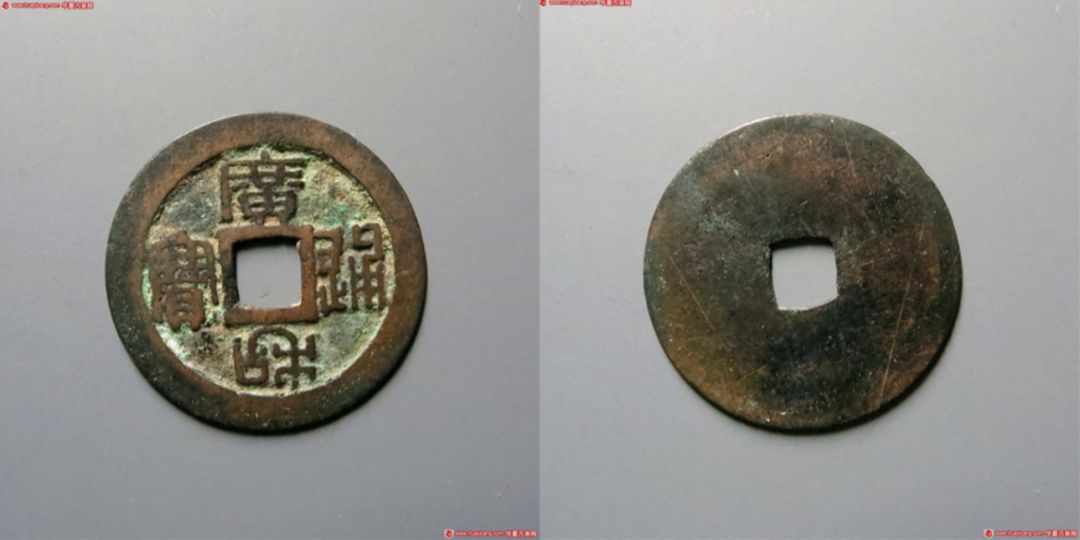 广和通宝北安南王莫福海广和年间(1541—1546年)铸,时在明嘉靖间。面文“广和通宝”四字楷书,章法精妙,边廓挺秀。径约2.4厘米,光背无文,此钱制作精良,唯存世不多。另有篆书小钱。