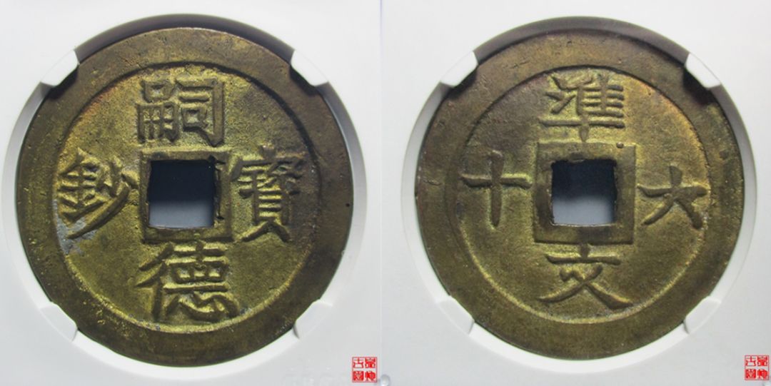 泰德通宝西山起义军首领阮文岳于1778年在归仁称帝,改元泰德,始铸泰德通宝钱,时当清乾隆中。此钱以各色杂铜浇铸,所出甚多。形仿景兴通宝钱,面文楷书,直读。有光背及背星月纹者。另有阔缘小字钱,背穿两侧铭草书“万岁”二字,系泰德十四年(1792年)阮文岳死前一年所造。泰德钱一般径2.3~2.4厘米,重0.8~2.5克。钱体薄脆,今世间屡见不鲜。