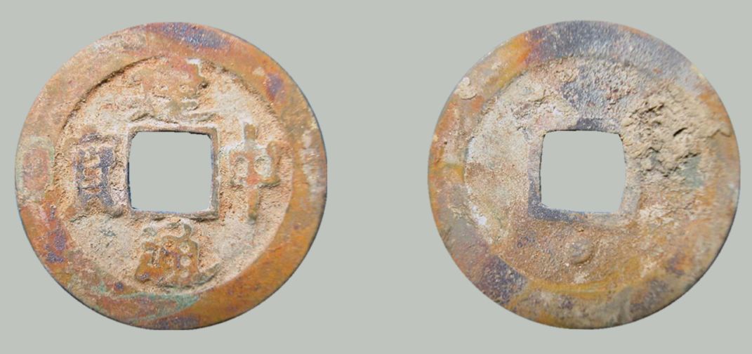 绍丰元宝陈朝裕宗绍丰年间(1341一1357年)铸,时值元至正年间。面文“绍丰元宝”旋读,有真、行、篆三体,然因铜差制粗,文字多不清晰。径约2.3厘米,背多夷漫;真书钱背穿孔上下铸有“十五”二字,或为记年。此钱存世绝少,很难一见。