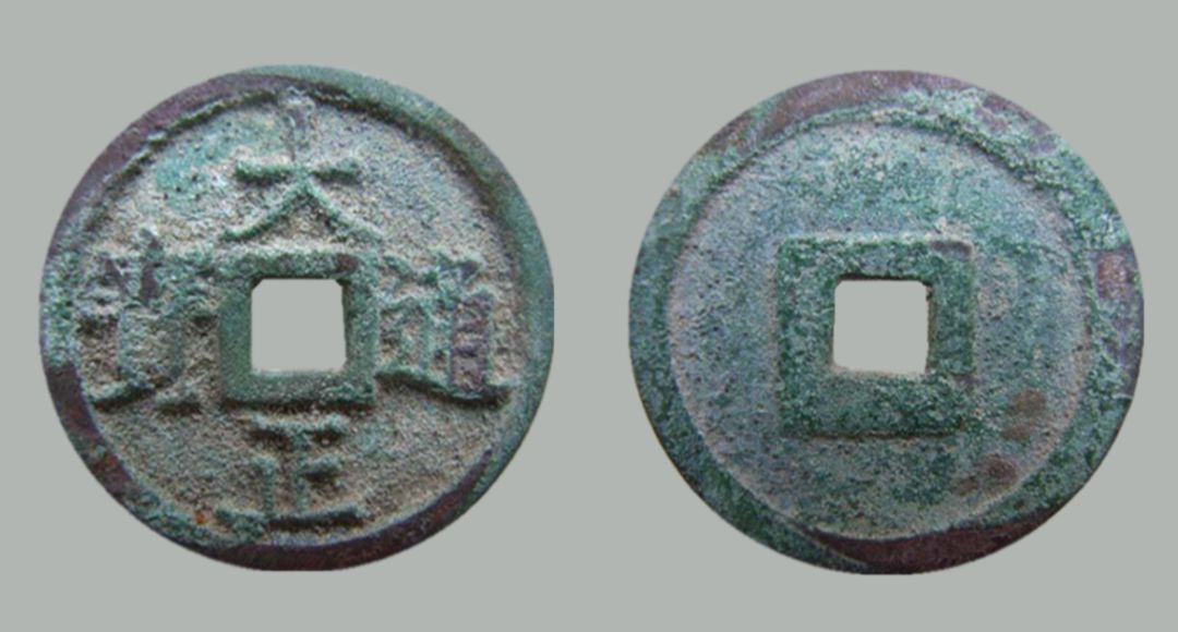 大正通宝北安南莫朝太宗莫方瀛大正年间(1530一1540年)铸,时当明嘉靖间。此钱形体较大,内郭稍阔,穿孔浑圆,面文贴近穿孔。“大正通宝”四字楷书,直读,光背无文。径约2.6厘米,制作尚工。大正钱存世不多,然尚可见。