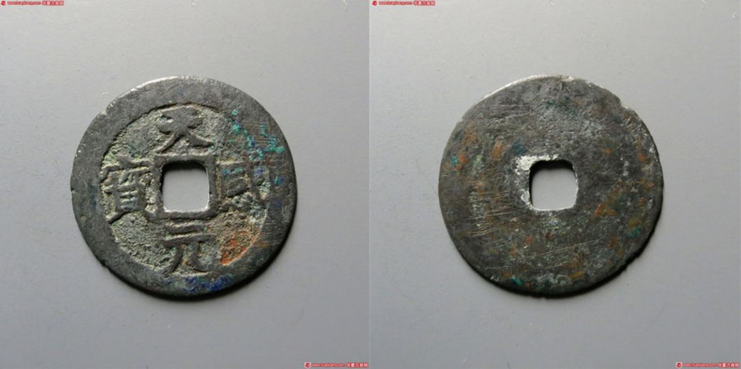 天庆通宝陈朝亡后黎利奉陈氏裔为安南王,改元天庆(1426年),并铸天庆通宝,时值明宣德元年。此钱铜色灰暗,肉薄字浅,“天庆通宝”四字隶书,直读,光背无文。径约2.3厘米,制作粗疏。旧谱曾将此钱列为辽天祚帝出或曰西夏钱,皆讹。辽、夏“天庆”文曰“元宝”且均旋读,制作亦较此钱精良,稍作比较则泾渭分明,不难鉴识。然安南天庆虽略多于西夏天庆,却较辽天庆稀罕,泉家眼中则不免身价十倍矣。