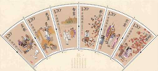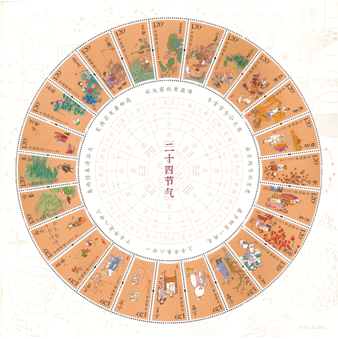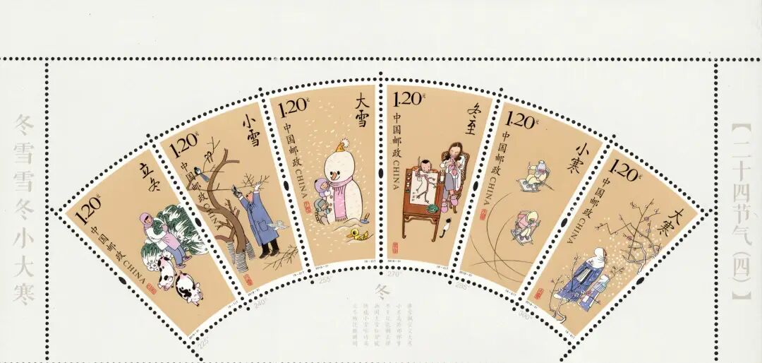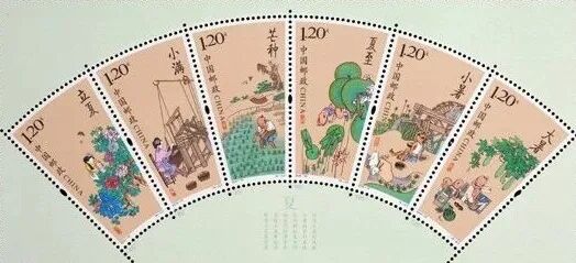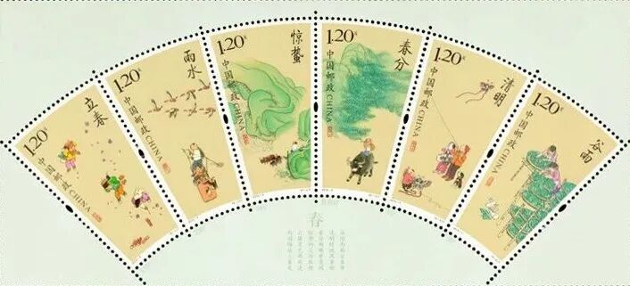 其实除了纪念币,中国邮政还曾发行过二十四节气邮票,24枚扇形邮票围成一个圆,每一枚邮票上都是一幅国画小品,一整个爱住了!