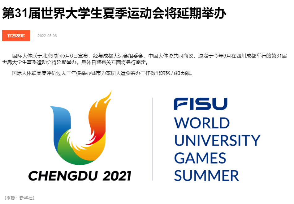 成都大运会去年就已经延期一次了,不过受到疫情影响,成都大运会官方宣布再次延期,时间未定。