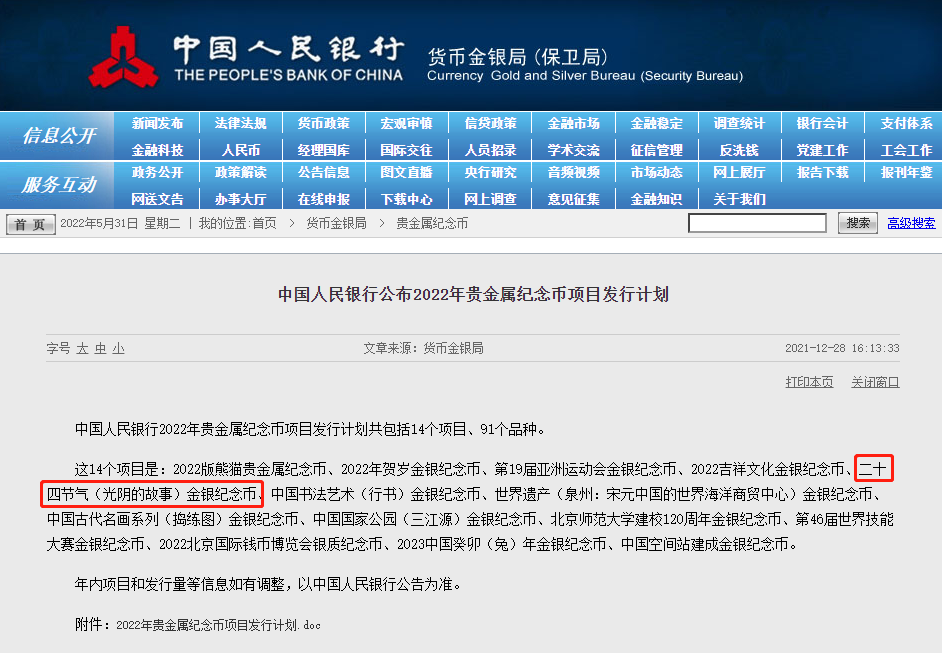 根据中国人民银行的发行计划,6月将发行二十四节气金银纪念币一套28枚,包含4枚金币和24枚银币。