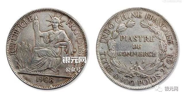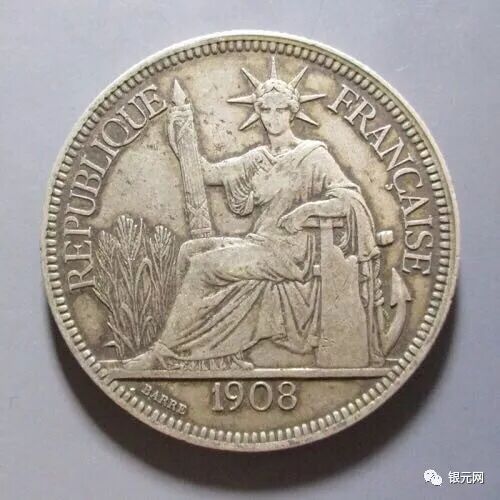 坐洋正面的主图为自由女神坐像,两侧的文字分别是“FRANCAISE(法兰西)”和“REPUBLIQUE(共和国)”,下方标注发行年份;背面的图案是装饰花穗及法文贸易银圆(意思是法兰西所属的印度支那)和标识字母,四周则记录了流通区域、含银量、银圆重量等要素。