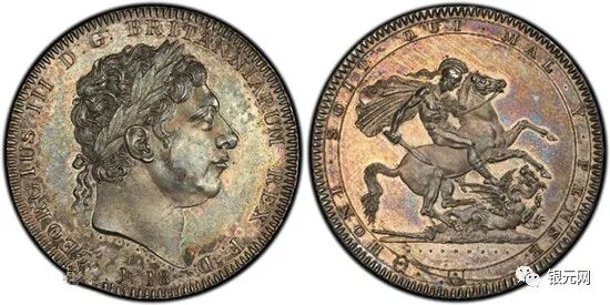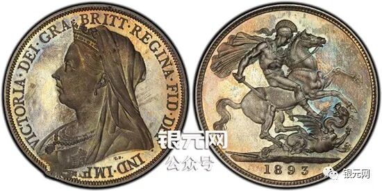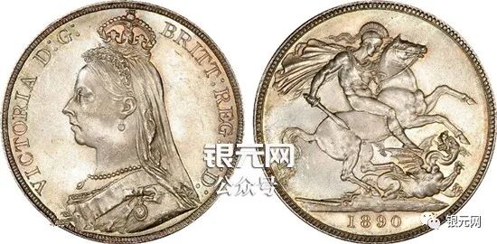 英国维多利亚时代(1837-1901)曾发行过圣乔治骑马屠龙的银币。该币正面是维利亚女皇胸像,背面是大英雄圣乔治骑在马上持剑斩杀滚在地下的有翅膀的海妖龙,行内俗称它为“英国马剑银币”。该币币值1克朗,但按照英国惯例,在银币上未标明币值。它是19至20世纪英国所发行的最大币值的银币和主要品种,有几种不同的版本。“银元网”公众号。直到现代,英国也还出产过圣乔治的马剑银币。因为这些银币的图案艺术性超强,雕像和铸工精致,在国际上有知名度,也受到银币收藏爱好者的特别青睐。