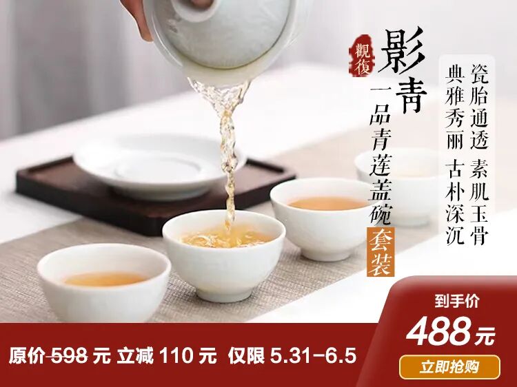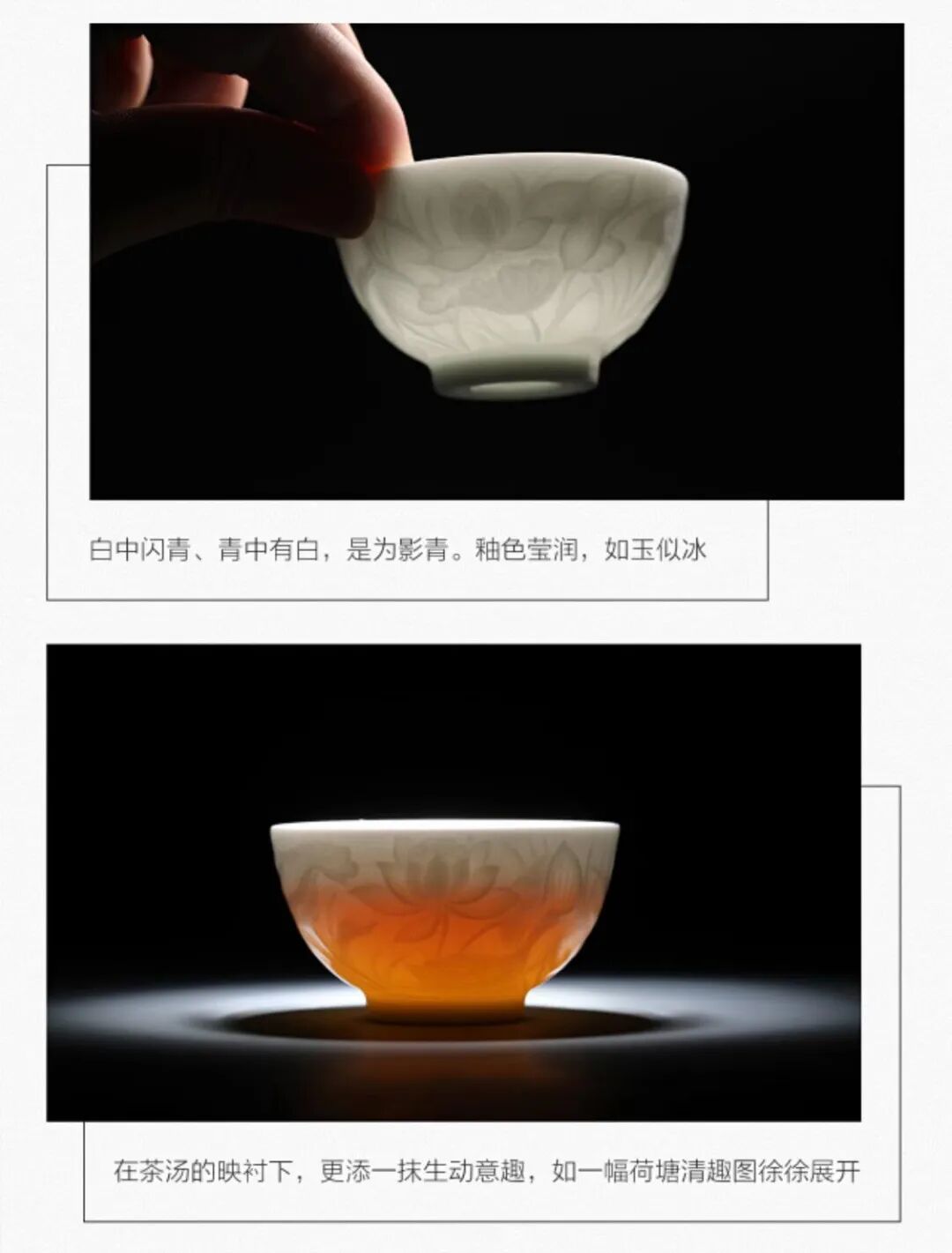 特意取影青瓷为其骨:影青从宋代时景德镇创烧,釉色介于青白之间,瓷胎通透,所刻花纹迎光照之内外可映,因其素肌玉骨,故也有“印青”“隐青”之美誉▼