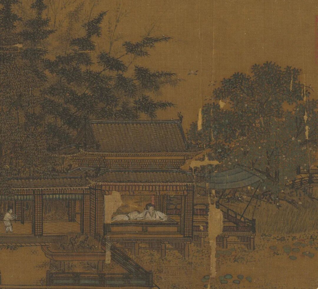你细看,下图是不是很像上图的细节放大版?仕女驾舟采莲,边插瓶做荷花清供,清凉且富诗意美。