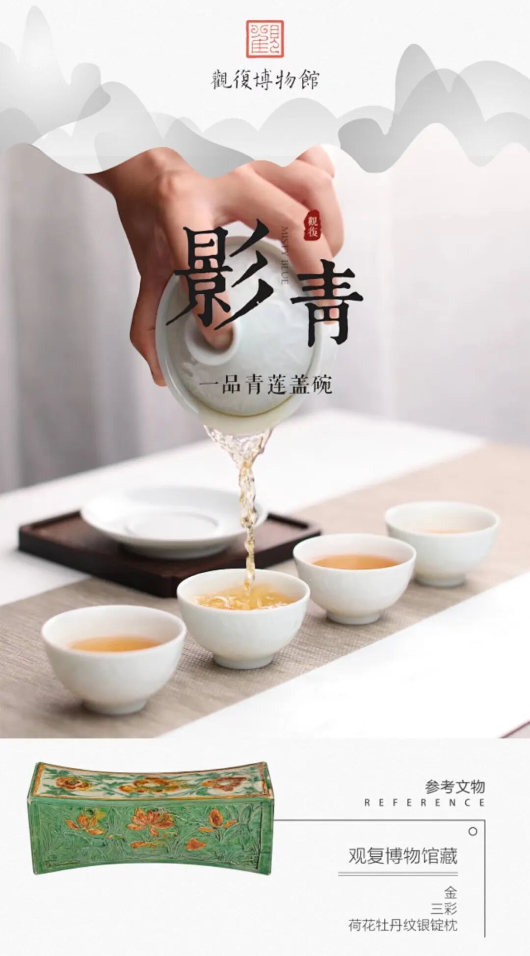 由物入道,佛心、净友、君子……物的情意乃人之情意,人的情意由古至今也就累积成了文化,观复博物馆也愿承袭一缕雅风,故以馆藏“金代三彩荷花牡丹银锭枕”为设计灵感,设计创烧了【一品青莲盖碗】▼