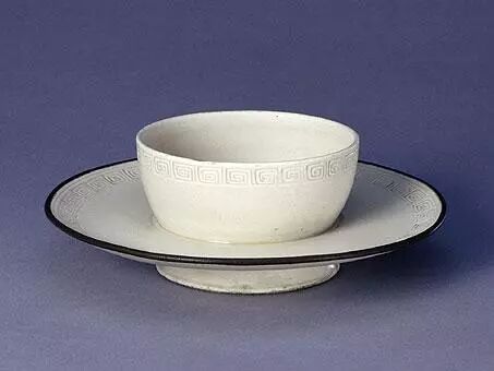 盏托上呈杯形,口沿无釉,托镶铜口,圈足外撇。里外施白釉,杯口与托口沿各饰回纹一周。