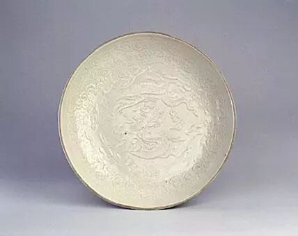 盘敞口,口沿无釉(俗称芒口),浅弧壁,圈足。通体施白釉,外壁釉垂流形成泪痕。碗内模印螭龙纹。胎体轻薄,胎色洁白。