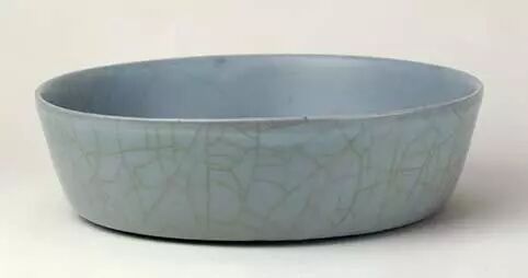 宋代官窑瓷器主要为素面,既无华美的雕饰,又无艳彩涂绘,最多使用凹凸直棱和弦纹为饰。其上纹片粼粼,愈显高洁古雅。这件官窑圆洗是宫廷御用器,在造型、工艺及装饰技巧方面都十分考究,尤以釉色及片纹突出。同时,借助于烧成后期的二次氧化作用,在釉层较薄的器口或未被釉层遮盖的器底部分,形成“紫口铁足”,使器物愈显古朴庄重。
