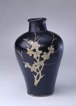 瓶小口,圆唇,短颈,丰肩,内凹足。通体施黑釉,器身剔折枝梅花,纹饰部分露黄色胎,花蕊用褐彩勾画,装饰效果极强。