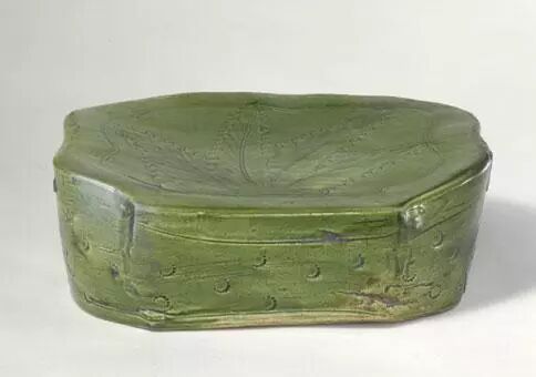 枕如意形,底中心有长方形孔。通体施绿釉,底素胎无釉。枕面依枕形外周划复线开光,开光内刻叶纹4片,枕侧戳印朵花。