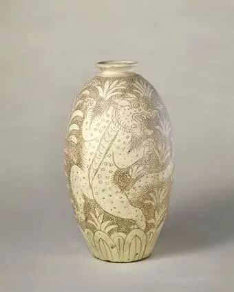 瓶形似橄榄,圈足。胎为灰褐色,施白色化妆土。瓶身刻划二虎,一站立,一行走,呲牙翘尾,均矫捷凶猛, 搏斗于草丛中,衬以洞石、芭蕉,近底处有一周莲瓣纹。图案以外空白处戳印珍珠形小圆圈。
