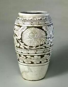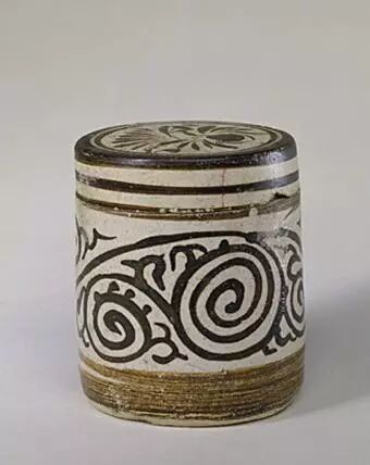罐直口,直壁,平底,附嵌入式盖。外壁采用白地褐彩装饰,主题图案为缠枝卷草纹,盖面饰一折枝花卉纹。图案简捷流畅,自然大方。这种装饰技法缘于北方磁州窑,但又有吉州窑自身的特色。其底色与纹饰色彩的对比没有磁州窑强烈,即白地泛黄,黑花发褐。江西南昌南宋嘉定二年(1209年)墓出土的奔鹿纹盖罐等器物为此类瓷器的断代提供了依据。(待续)
