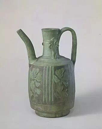 器直口,长颈,椭圆形腹,壶体一侧为长圆形弯曲的流,另一侧为圆柱形柄,圈足。颈部两侧对称贴塑花纹。通体施绿釉,釉层较薄,露胎处呈黑褐色。腹部以剔刻的四条竖道为一组间隔出六个开光,开光内剔刻折枝花卉。