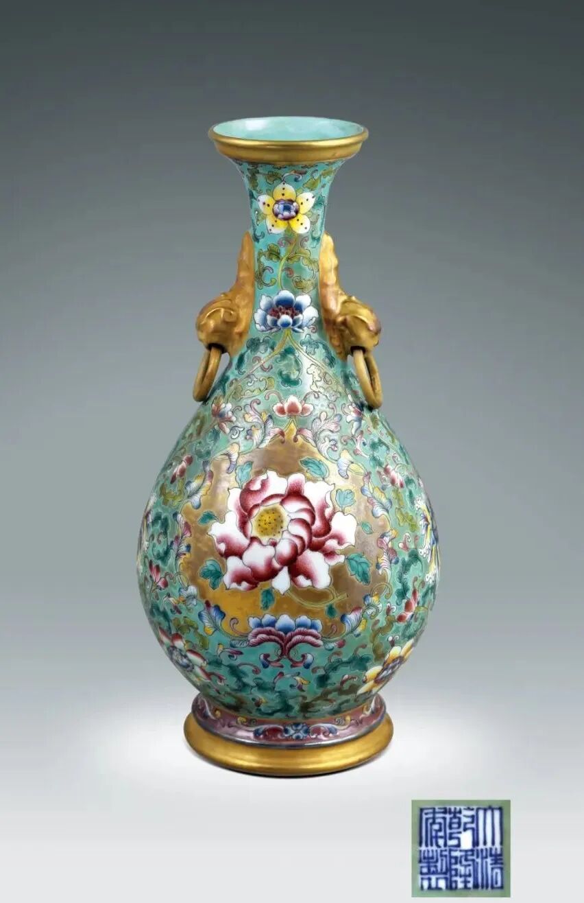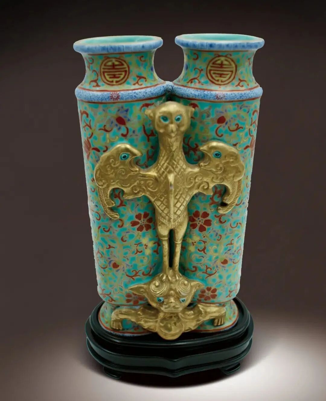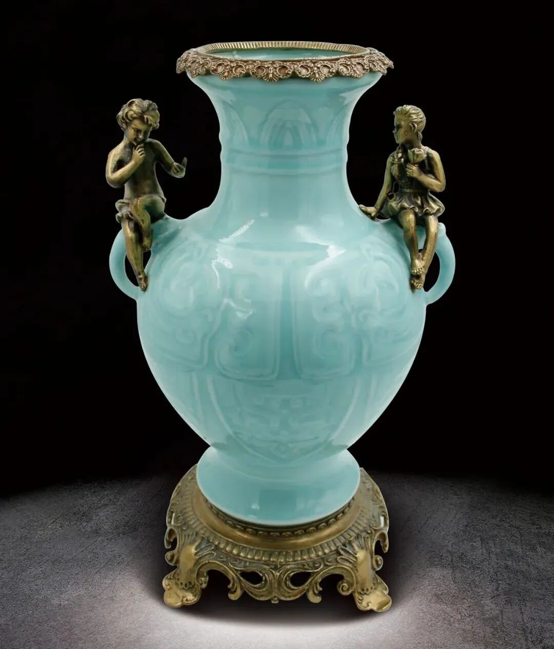 32 清 銅鎏金西洋人物鑲天青釉瓶