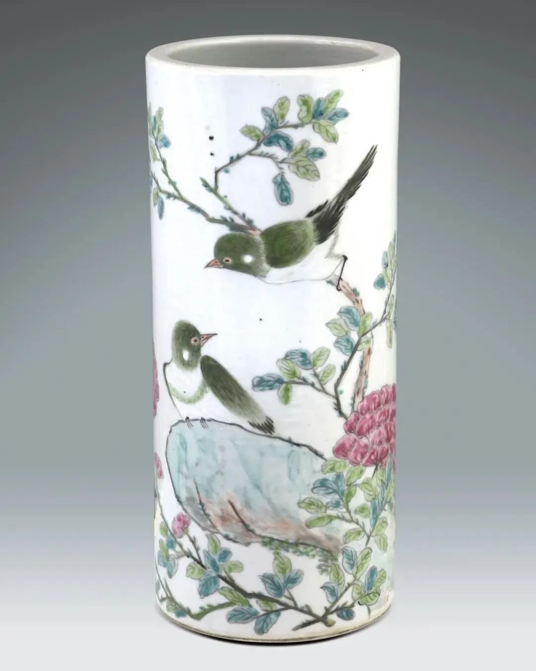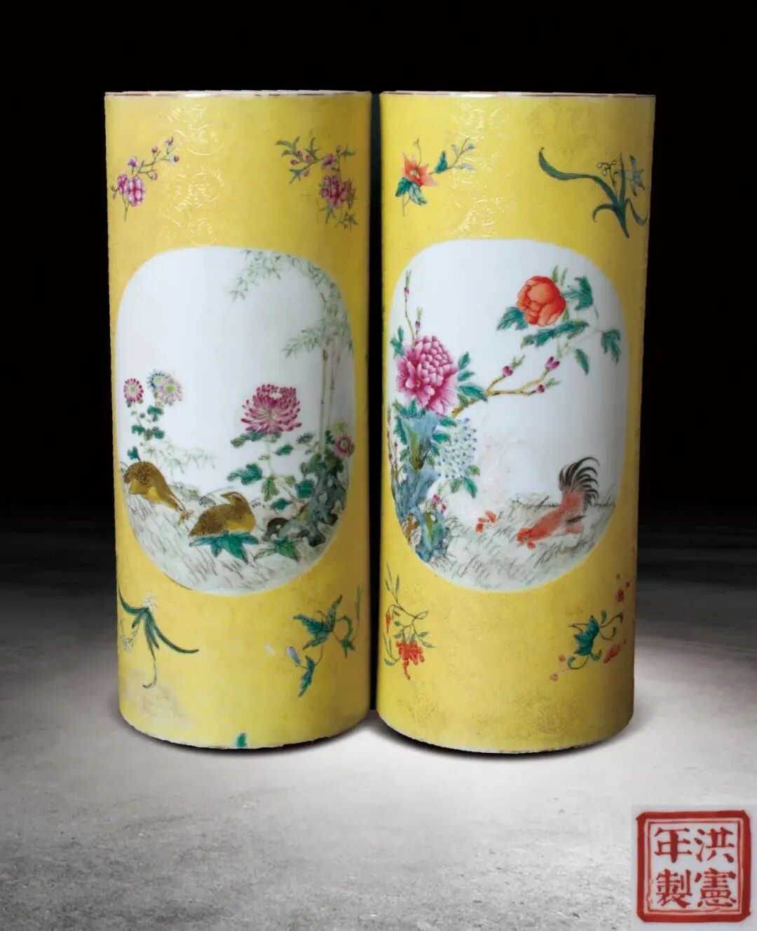 6 清 粉彩黃地開光花卉紋帽筒一對