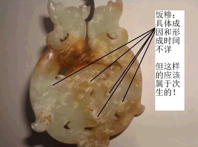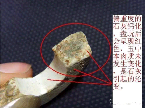 这是玉石一种变质现象,多由氧化和复分解过程而形成比较疏松的物质,所以较为松脆,怕磕碰。这种钙化层就越厚。