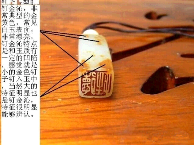 钉金沁的沁占呈钉子眼儿状,带色,抽坑,有棕色、紫色、灰色、黑色等,大都伴有线状凹陷。呈灰黑色或黑色的叫钉金水银沁。形成钉金沁至少需要1500年以上。