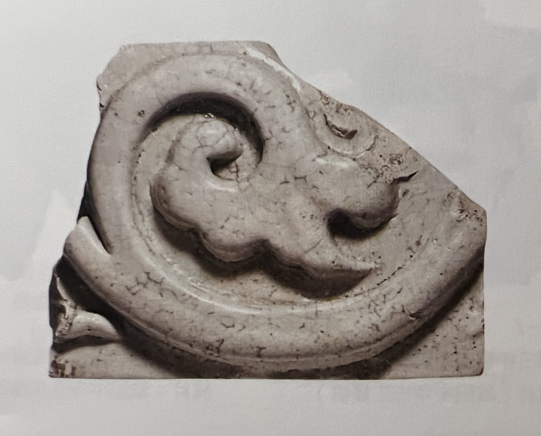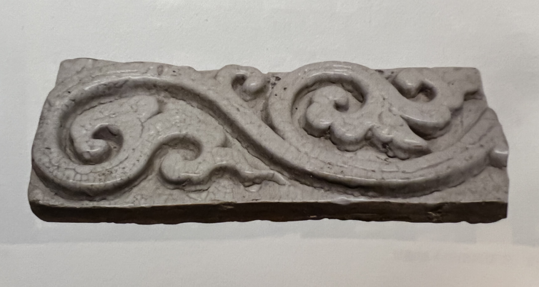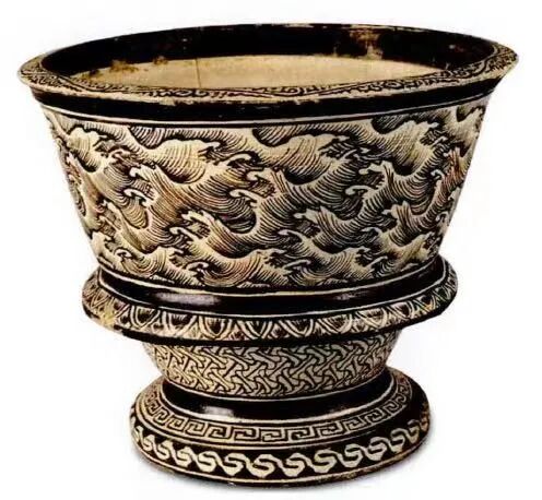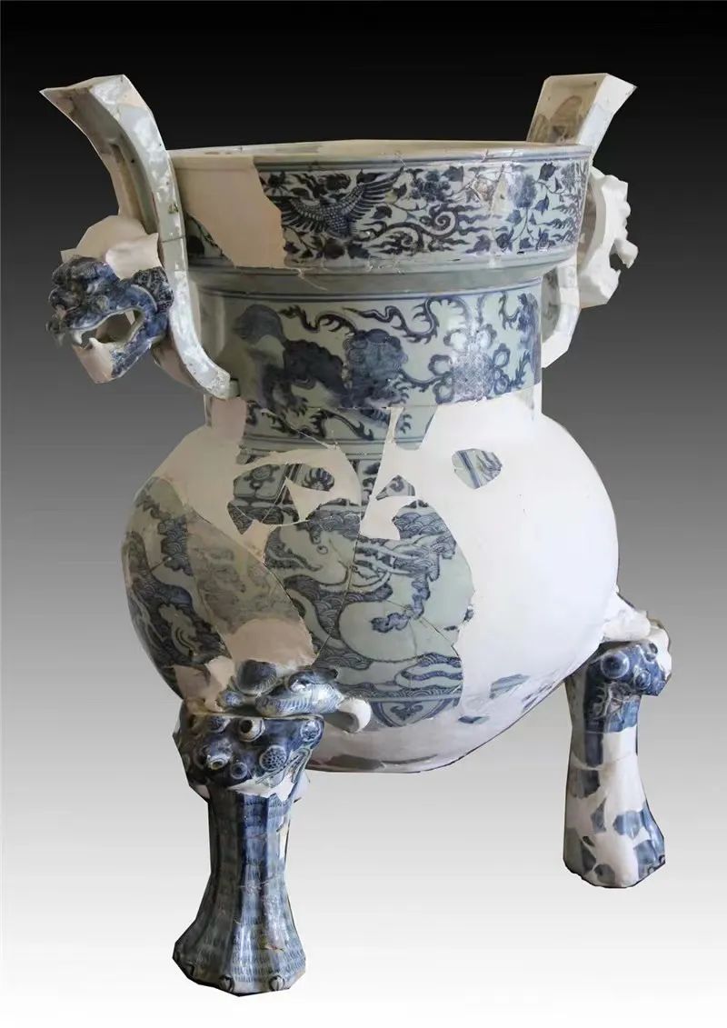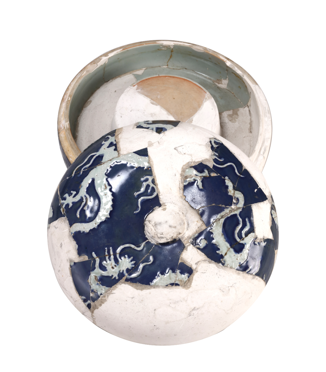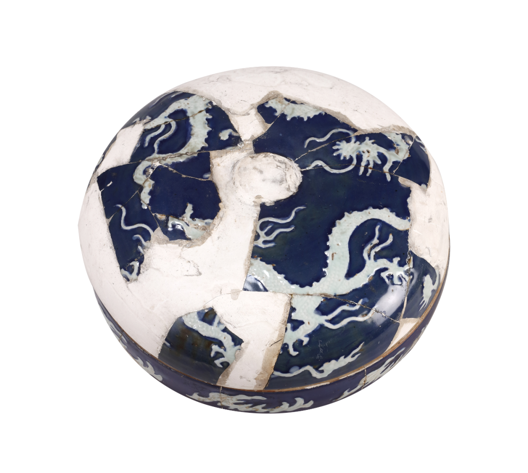 如前所述,在民族与宗教意义上寓意圣洁的白与蓝在元明景德镇瓷器中均有精彩体现。而于一器中,蓝白鲜明对比最富于艺术感染力的作品莫过于元蓝釉地刻白龙梅瓶了,扬州博物馆、北京颐和园与巴黎吉美博物馆各藏一件。帝王象征之矫健的三爪白龙遨游于深邃的蓝釉苍天,似象征帝王受到祖先、长生天与佛法的多重庇佑,极为神秘尊贵。本次展品之1988年御窑珠山北侧出土之蓝釉地海水白龙纹砚盒亦采取相同工艺,并无完整器传世,极为珍罕。元代同时期或稍晚,景德镇又创烧青花海水地留白刻龙纹品种,以1964年保定窖藏出土两件青花留白八棱梅瓶及镇江出土之青花留白龙纹大炉为代表。其以青花满绘海水波涛的风格应来自于南宋吉州窑水波纹瓶,极富动感。这一青花海水地白龙的样式为明初永乐一朝所继承发扬,并更臻化境,成为永乐开创中华大航海时代的艺术象征。