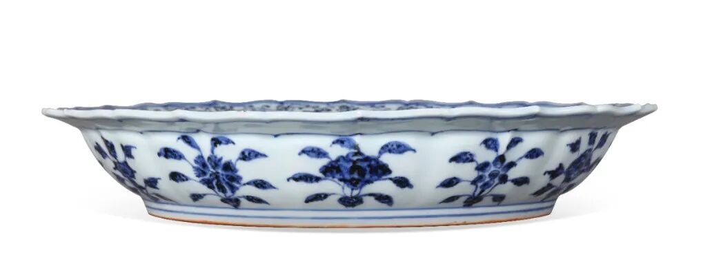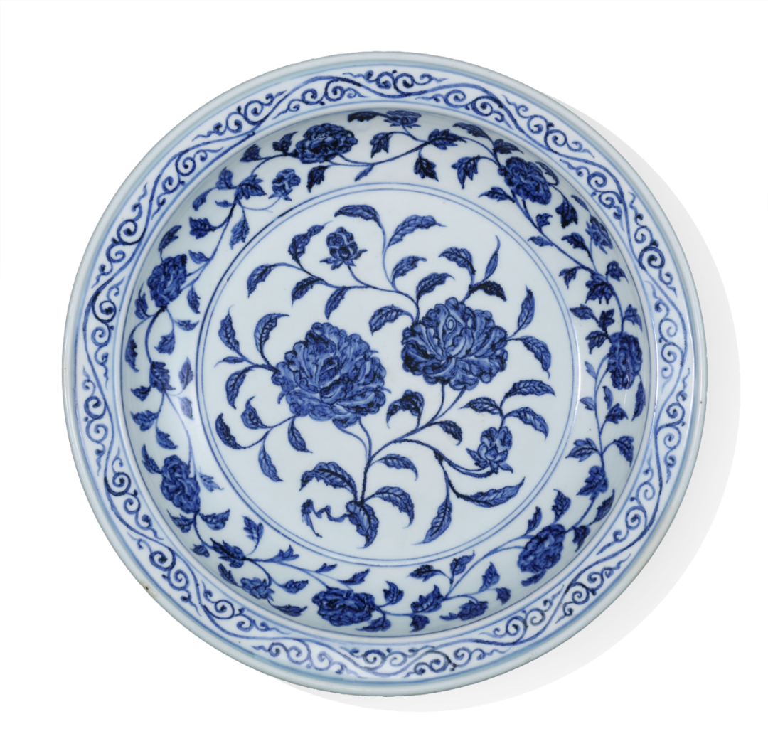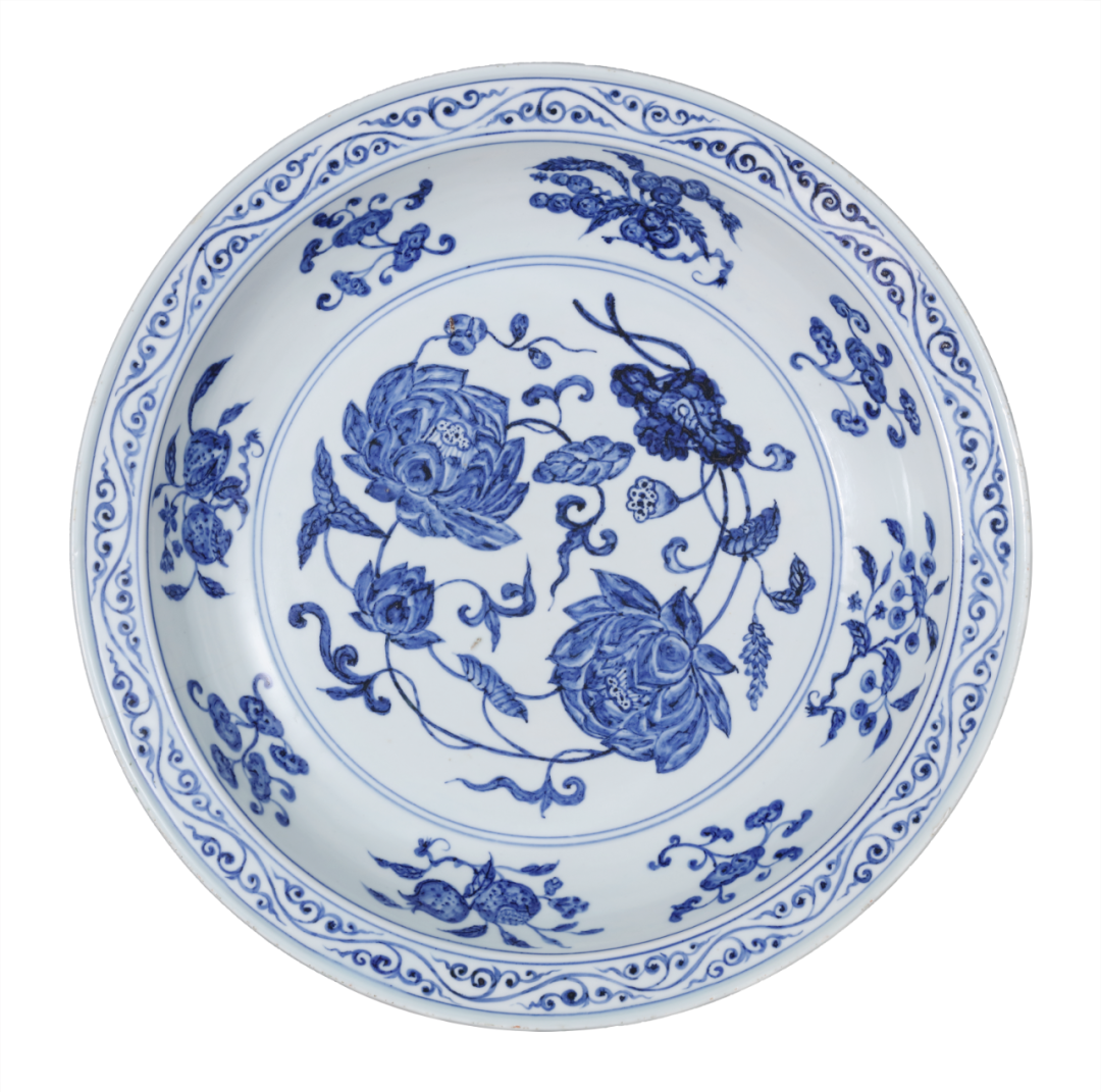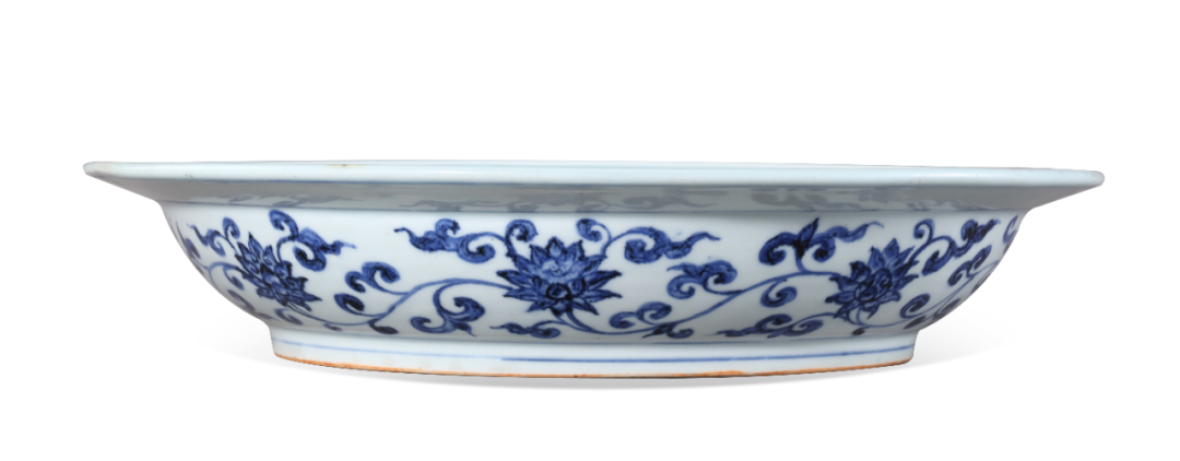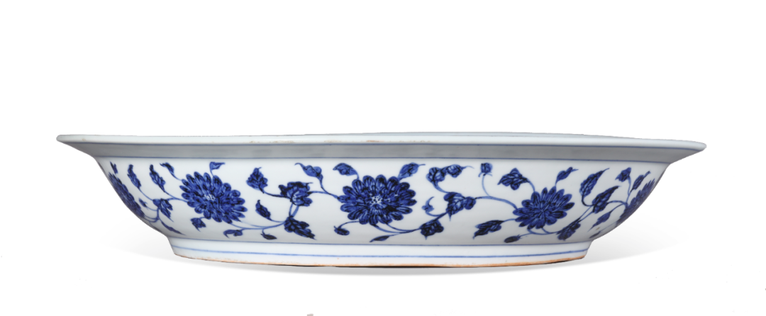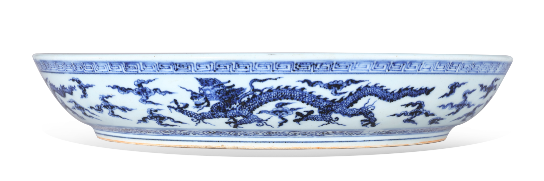 本品形制规整,大口微敛,弧腹广底,浅圈足,为明初大体量盘式的经典造型。盘底砂底无釉,可见胎体坚致细腻,足沿微泛火石红。通体青花描绘纹饰,口沿内外绘回纹一周,内壁绘牵连缠绕的缠枝花卉十二朵,计有山茶、莲花、月季、扁菊等数种;外壁绘向前奔走的行龙四条,龙口半张,脑后毛发向前竖起,龙须向两侧飞扬,其间以壬字云纹间隔。盘心青花双圈内绘奔涌的海水为地,再以留白技法表现一侧面立龙,仅双目龙睛以青花点绘,龙身下肢朝向画面右侧,身躯中段则向后扭动,使得上肢及龙首面向画面左侧,上肢两只前爪一前一后,龙嘴张开,龙角后的鬃发上扬,气势威猛,身旁围绕的火焰亦以留白技法表现,在青花海水地子的衬托下,使得龙形似乎站立在波涛之上,极具艺术表现力。