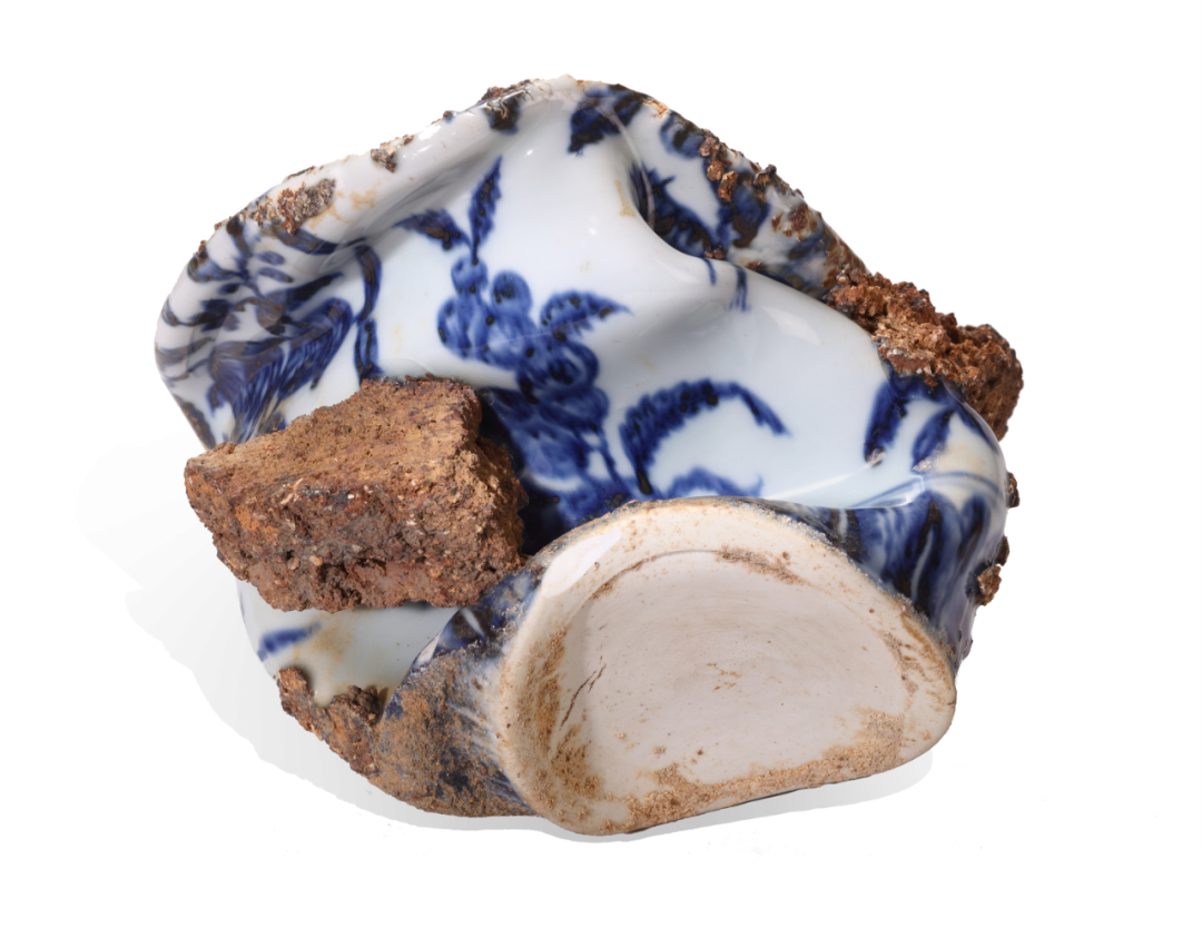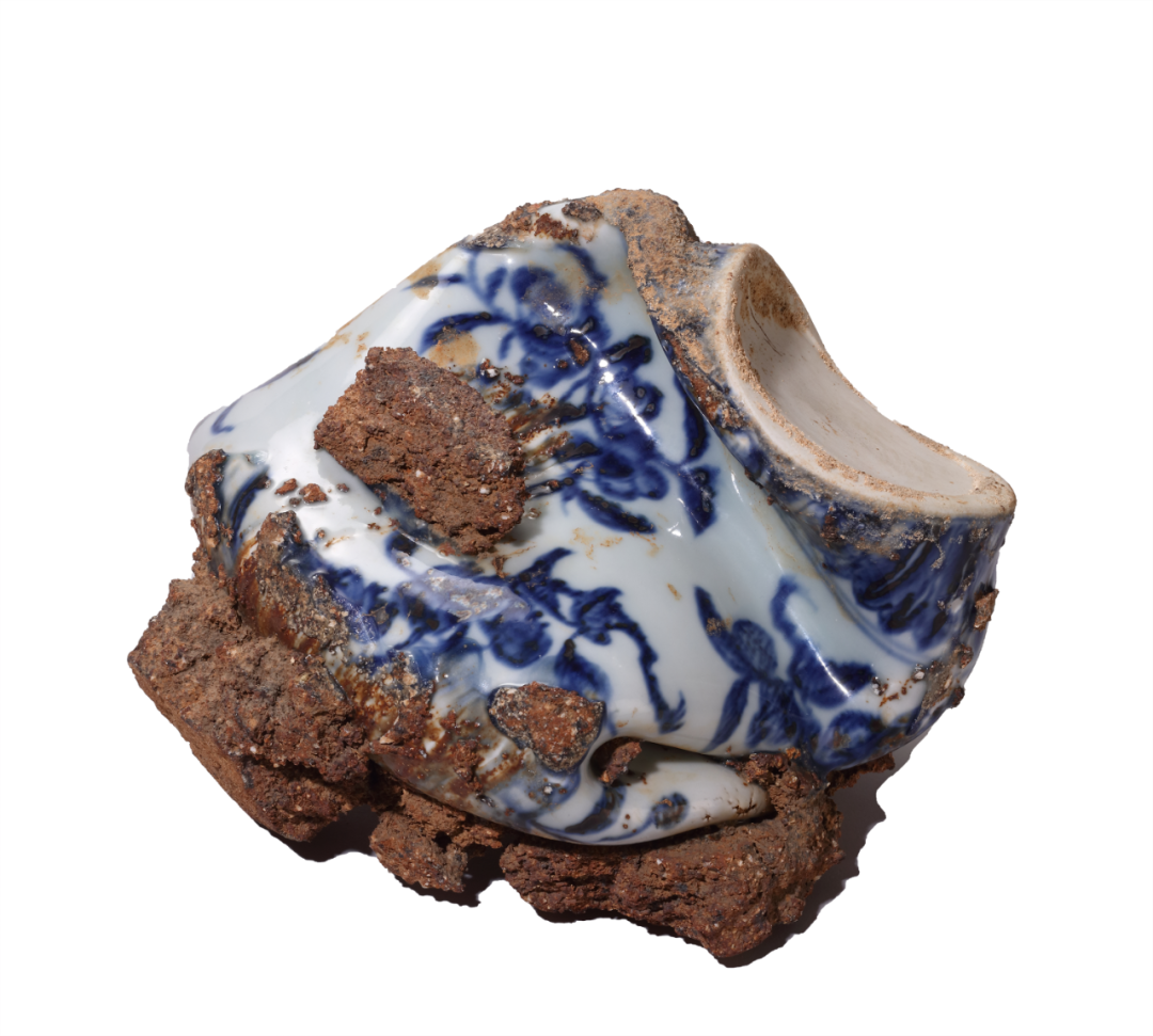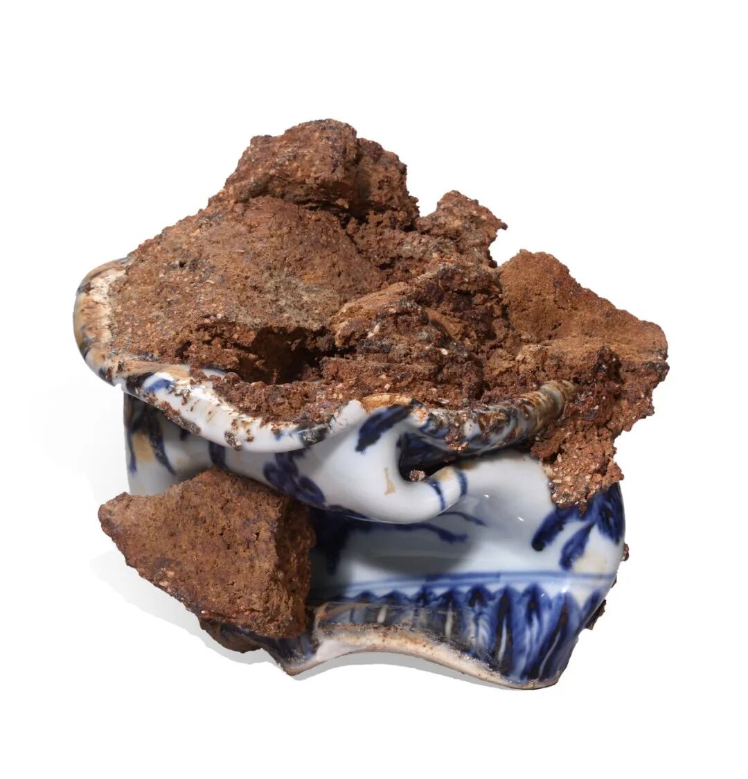 这种“深厚浓艳之趣”便体现于本次展品的永乐青花折枝瑞果大梅瓶和青花缠枝花卉菱口盘等作品。御窑出土器中则对应一件1988年珠山南麓东司岭所出青花折枝瑞果梅瓶,此瓶在烧造过程中胎体塌陷,与匣钵粘接,但瓶口、瓶底皆完整,成为一件被压扁的扭曲梅瓶,从底径12厘米判断,原瓶高度应为28.5厘米左右制式。本器青花色泽幽菁,釉光莹润如玉,于600年前经历的一次窑火意外使这件本应亭亭玉立的梅瓶折叠、凝固成今天扭曲的存在,宛如历经了一段相对论的时空隧道,在梅瓶美丽的骸骨中我们仿佛看到达利笔下弯曲的钟表和毕加索、培根画中那些解构的面孔。灵魂可以出窍焉。
