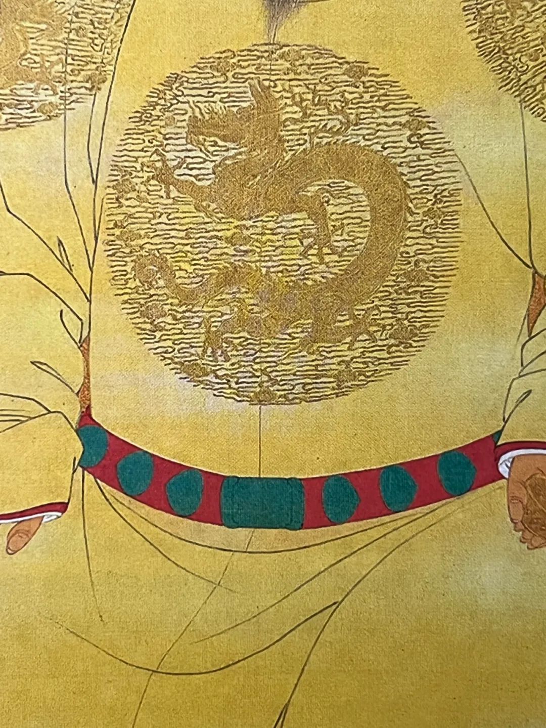 本品之图像学意义亦颇可考究,盘心白龙口齿张开,怒发上冲,龙须扬起,有威加四海之气势,造型与现藏台北故宫的明太祖与明成祖御容画像中皇帝所穿明黄色常服上之团龙纹饰十分相近,可见此式龙形纹样颇得洪武、永乐青睐,并将其运用于各式不同工艺门类,与明初剔红漆器、金器之龙纹亦十分接近。永乐帝御容原在北京故宫南薰殿所贮,出自明朝内府画师之手,其对永乐面貌的描绘无疑是十分写实的,其面目肃穆威仪,气宇不凡,尤其是胡须的样式颇为独特,分作五绺,髭须与下颌两侧的两绺长须应当是特意加以定型,与前后洪武、洪熙、宣德诸帝胡须样式均不同,试将本品白龙形象与成祖御容相对比,二者确有神似之处。