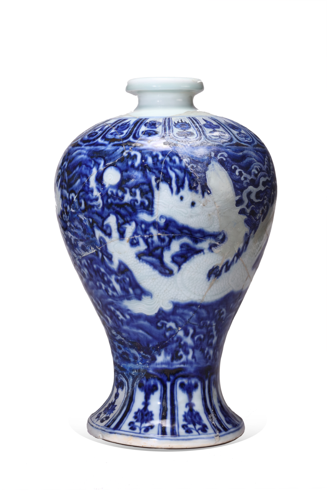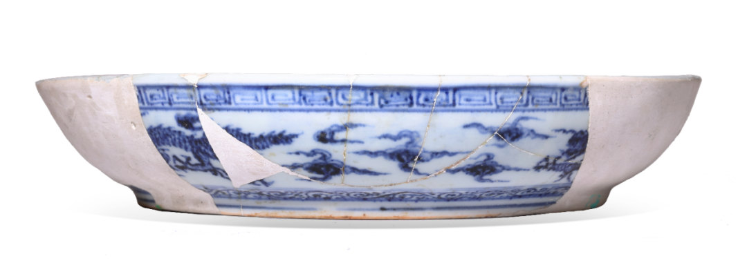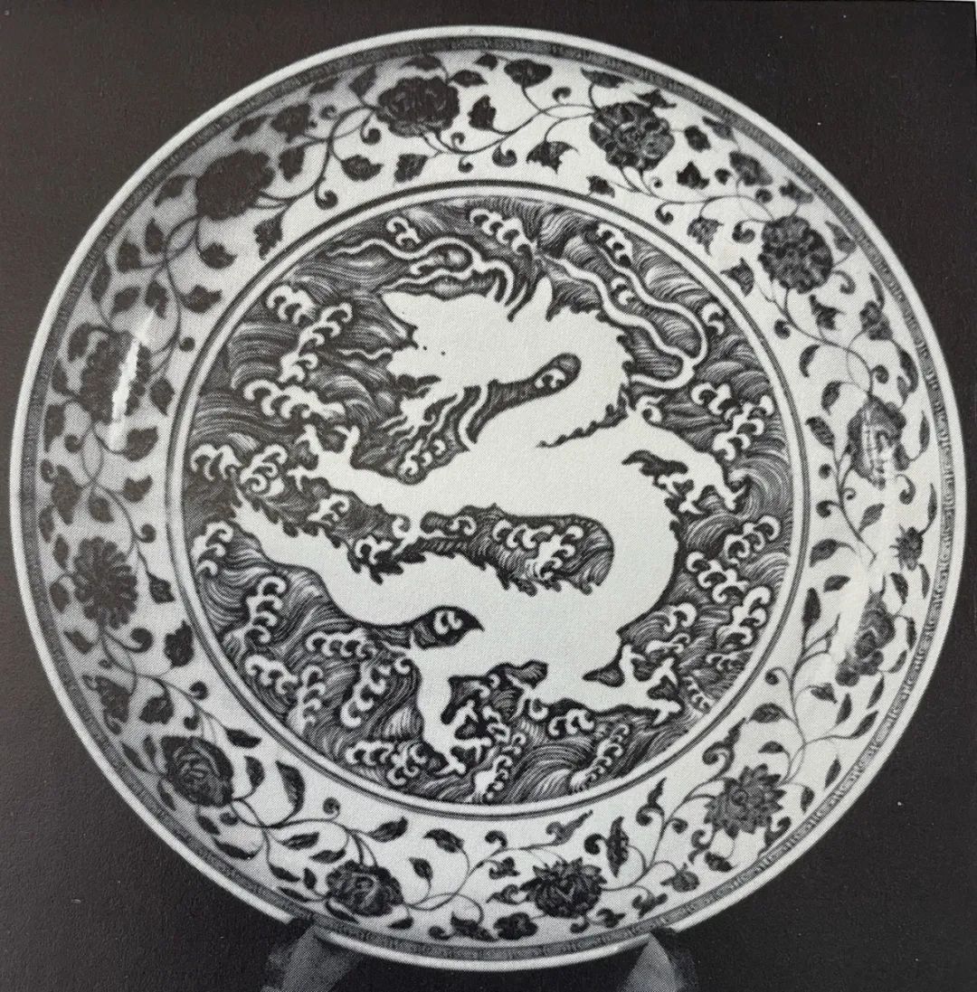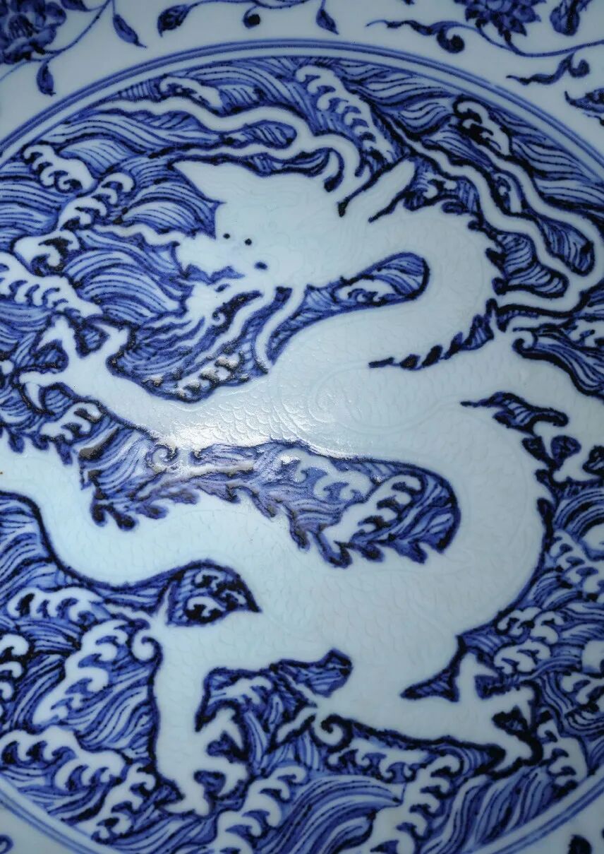 盘心留白而成的白龙纹样于明初青花器中十分罕见,并多为袭宋元遗风的三爪龙形。采用此种技法者,所见均为御窑重器,以天球瓶最为知名,北京故宫博物馆、大英博物馆大维德基金会、伊朗国家博物馆、日本出光美术馆等均有收藏,此外还有梅瓶、大碗等造型。叶喆民先生对这一品种的艺术表现力的评价颇为中的,“用浓重深厚的青色海水衬托出一条矫健飞舞的白龙,使人感到仿佛它置身于波浪滔天、汹涌澎湃的大海中,腾云驾雾,气势凶猛。尤其是深蓝的海水与洁白的龙身形成鲜明的对比,充满了动力美,充分表现了匠师们不同凡响的艺术才能。”