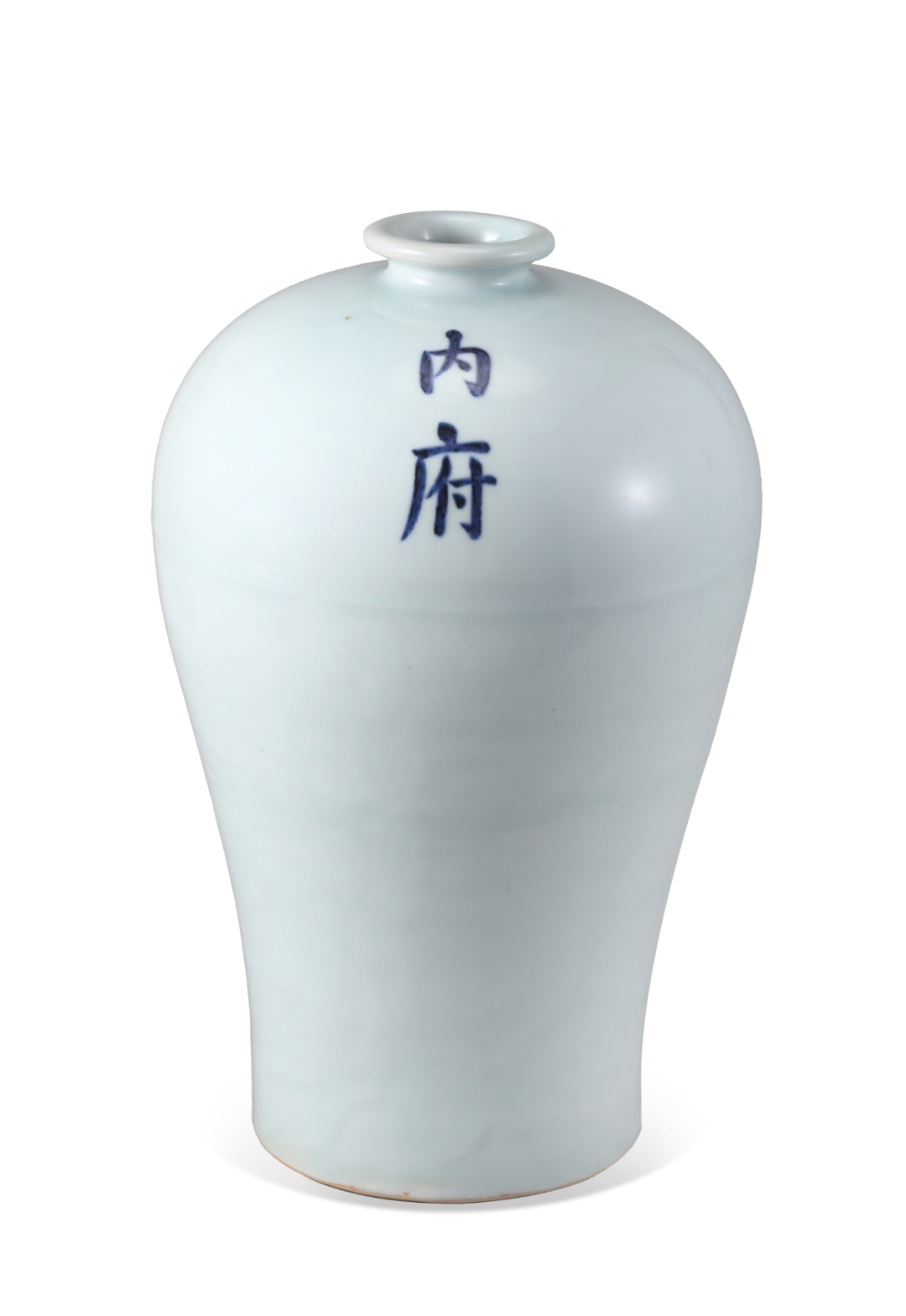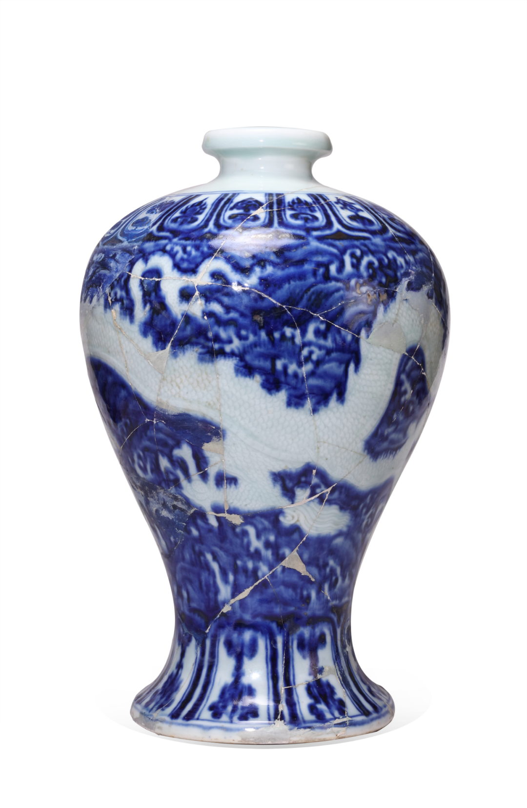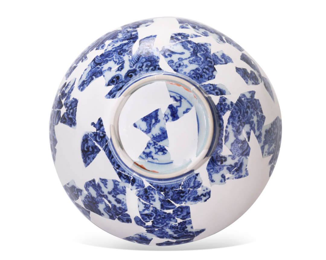盘心留白而成的白龙纹样于明初青花器中十分罕见,并多为袭宋元遗风的三爪龙形。采用此种技法者,所见均为御窑重器,以天球瓶最为知名,北京故宫博物馆、大英博物馆大维德基金会、伊朗国家博物馆、日本出光美术馆等均有收藏,此外还有梅瓶、大碗等造型。叶喆民先生对这一品种的艺术表现力的评价颇为中的,“用浓重深厚的青色海水衬托出一条矫健飞舞的白龙,使人感到仿佛它置身于波浪滔天、汹涌澎湃的大海中,腾云驾雾,气势凶猛。尤其是深蓝的海水与洁白的龙身形成鲜明的对比,充满了动力美,充分表现了匠师们不同凡响的艺术才能。”