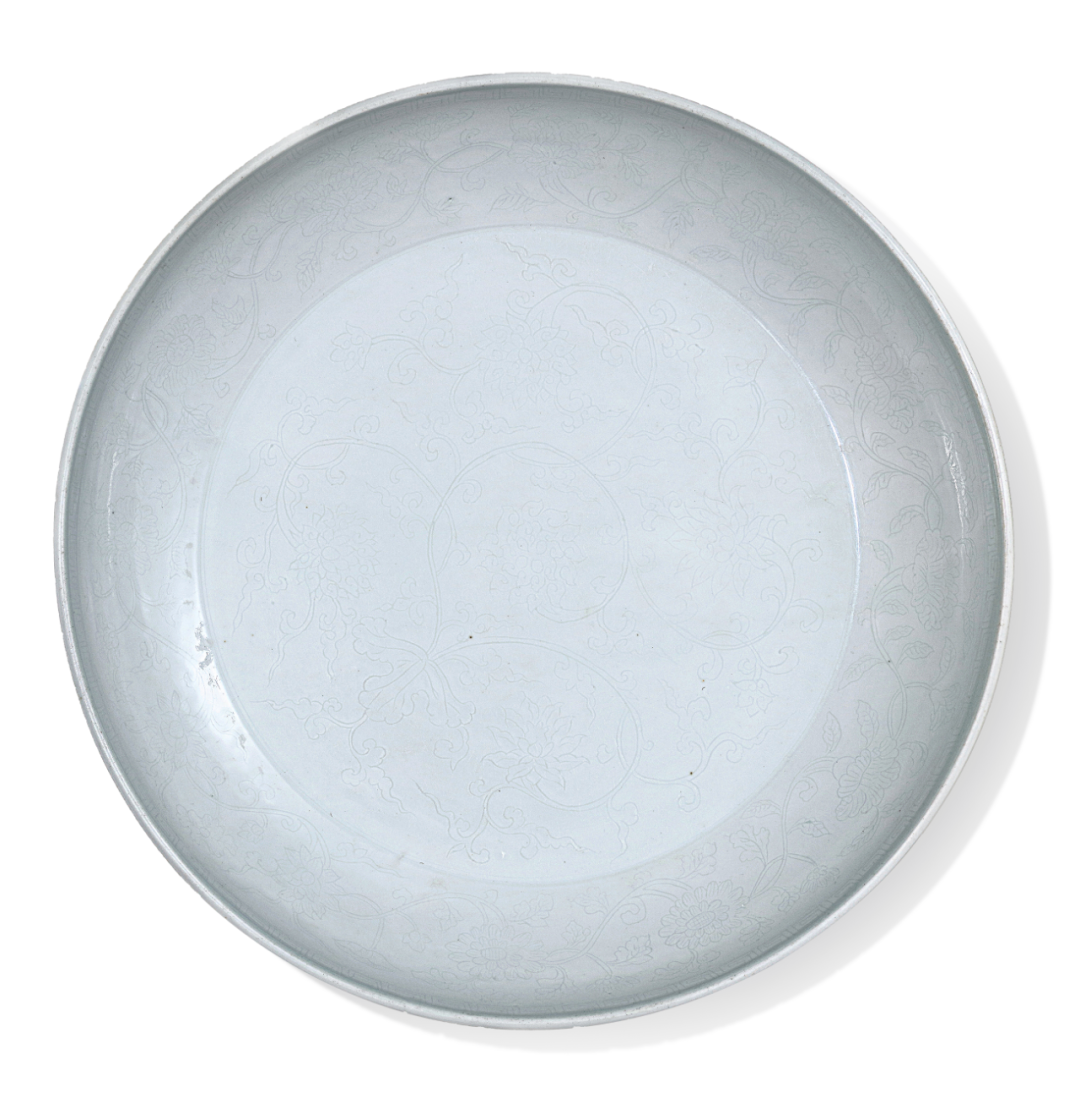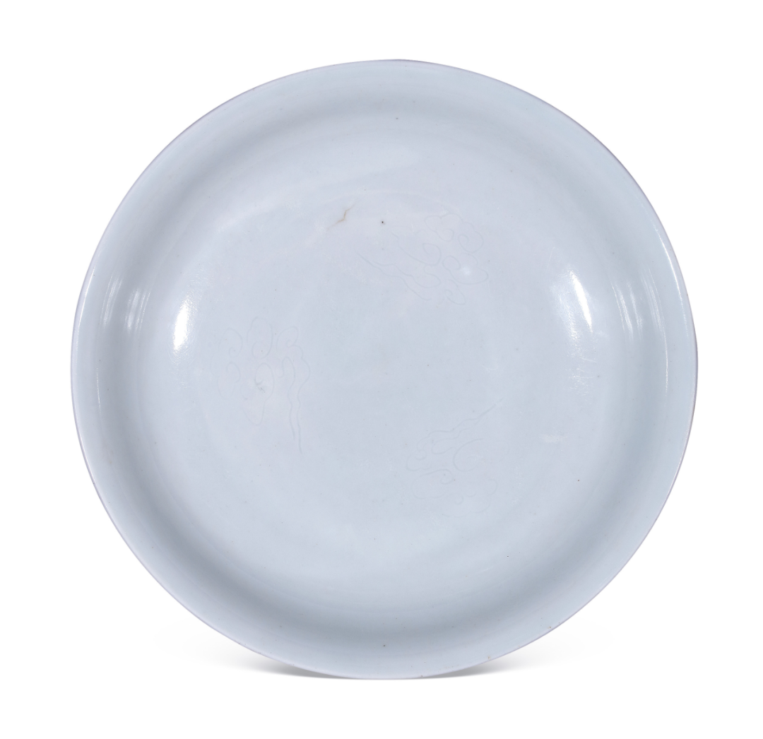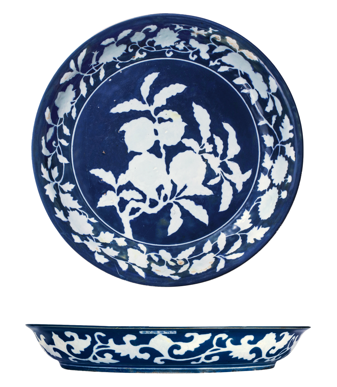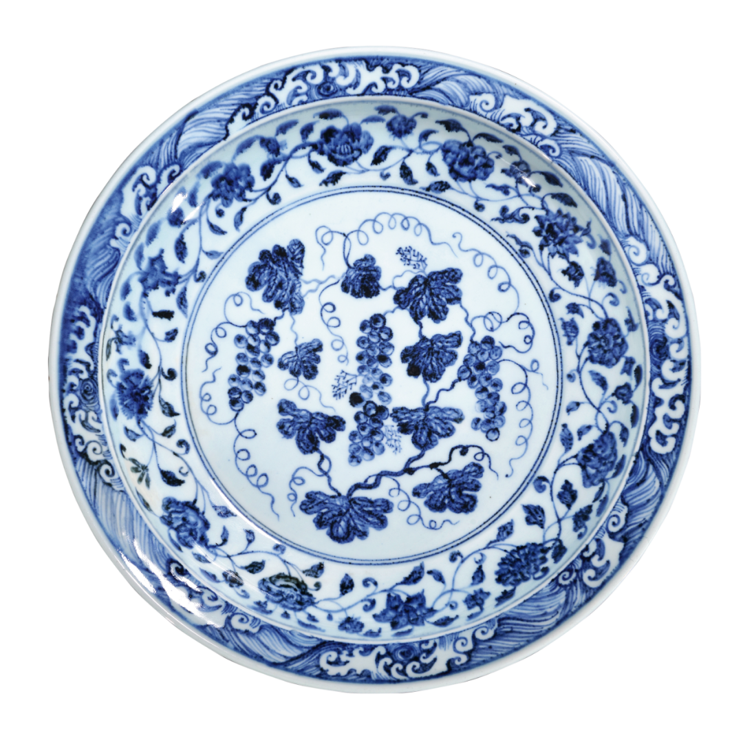 本次展览中,将展出一件于欧洲秘藏近百年的永乐御窑神品——“明永乐青花留白暗刻龙纹海浪大盘”,这也是这一重器重回故国的首次亮相。本件大盘形制规整,大口微敛,弧腹广底,浅圈足,为明初大体量盘式的经典造型。通体青花描绘纹饰,内壁绘牵连缠绕的缠枝花卉十二朵;外壁绘奔龙四条,其间以壬字云纹间隔。盘心青花双圈内绘奔涌的海涛为地,再以留白技法浅刻须爪鳞片表现一半侧面立龙,仅双目龙睛以青花点绘,身旁围绕的火焰亦以留白技法表现,在青花海水地子的波涛衬托下,使得龙跃于渊,极具神韵。