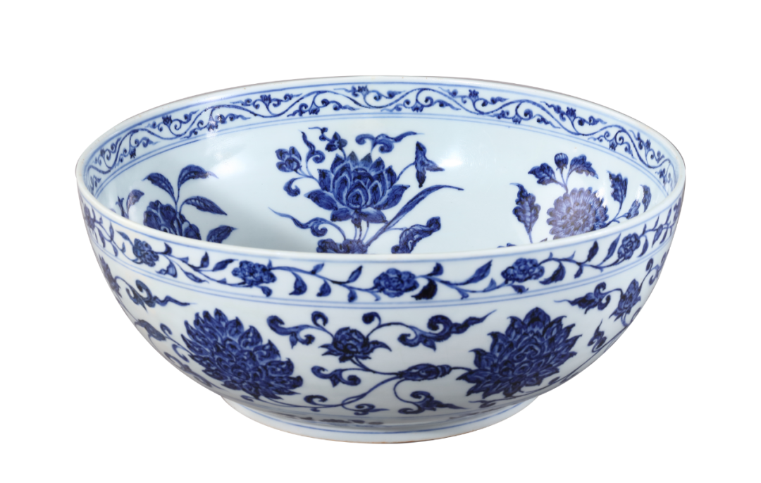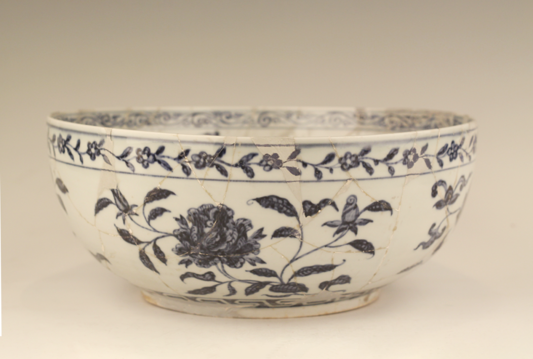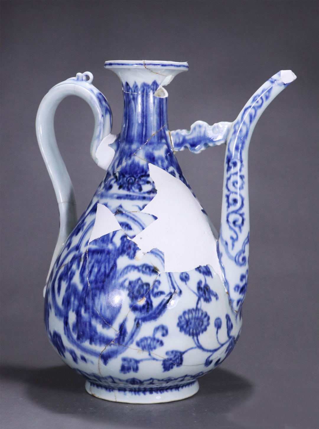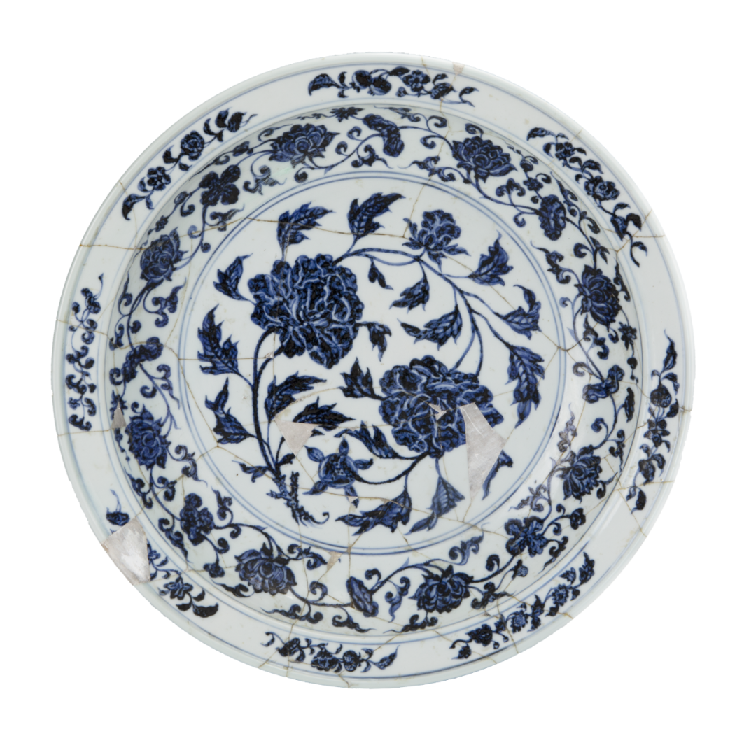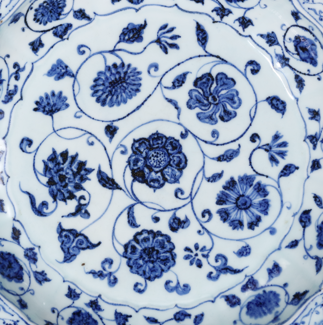 元明之际青花瓷器在原料、技术、纹饰等各个方面,受到中亚、波斯地区釉下彩陶的的影响,与伊斯兰文化有着密切的联系,“明人对于瓷业,无论在意匠上、形式上,其技术均渐臻至完成之顶点。而永乐已降,因波斯、阿拉伯艺术之东渐,与我国原有之艺术融合,于瓷业上,更发生一种异样之精彩。”(吴仁敬,辛安潮。《中国陶瓷史》,商务印书馆,1936)产自中亚的“苏麻离青”钴料飘洋过海运抵景德镇,最终在中国工匠的毛笔下描绘而成的,既有布局繁密、充满伊斯兰风情的“回回花”图案,也有疏朗有致、蕴含笔墨趣味的花鸟异兽。“高铁低锰”的进口青料给瓷绘带来了不小的挑战,若纯用苏料,发色固然深沉紫妍,但因青料淘洗研磨后仍含有氧化铁微粒的问题,绘制的纤细线条中常有黑色的小点,落笔重处则会使铁元素聚集,形成黑斑;而“低铁高锰”的国产青料在绘制时,发色虽呈灰蓝,但呈色稳定。故实际绘制时,工匠常将进口料与国产料搭配使用。