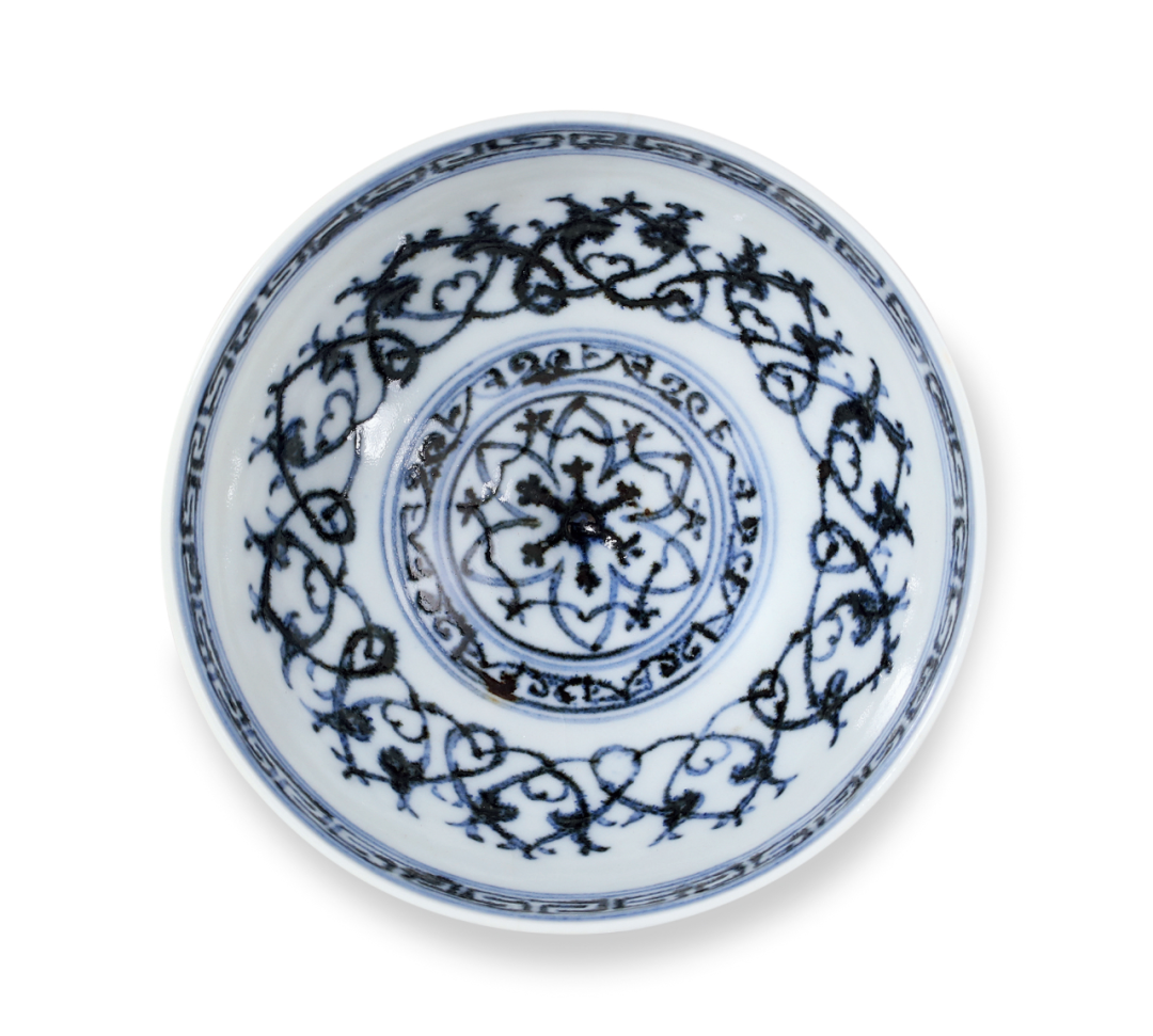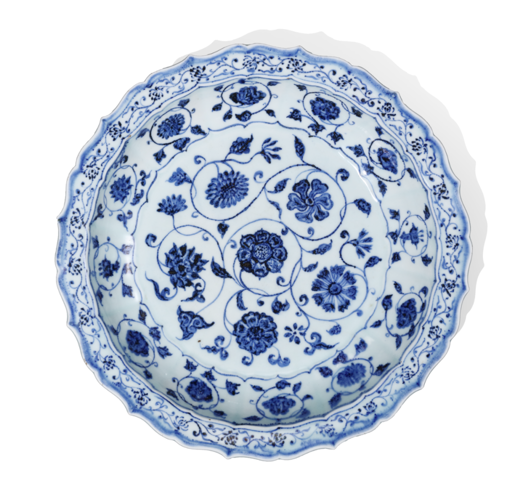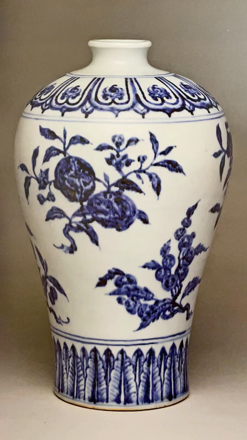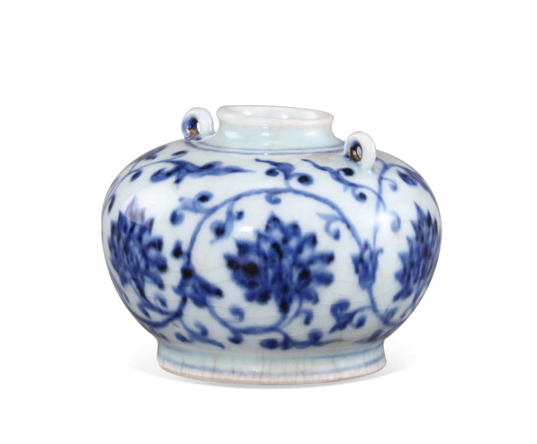 元明之际青花瓷器在原料、技术、纹饰等各个方面,受到中亚、波斯地区釉下彩陶的的影响,与伊斯兰文化有着密切的联系,“明人对于瓷业,无论在意匠上、形式上,其技术均渐臻至完成之顶点。而永乐已降,因波斯、阿拉伯艺术之东渐,与我国原有之艺术融合,于瓷业上,更发生一种异样之精彩。”(吴仁敬,辛安潮。《中国陶瓷史》,商务印书馆,1936)产自中亚的“苏麻离青”钴料飘洋过海运抵景德镇,最终在中国工匠的毛笔下描绘而成的,既有布局繁密、充满伊斯兰风情的“回回花”图案,也有疏朗有致、蕴含笔墨趣味的花鸟异兽。“高铁低锰”的进口青料给瓷绘带来了不小的挑战,若纯用苏料,发色固然深沉紫妍,但因青料淘洗研磨后仍含有氧化铁微粒的问题,绘制的纤细线条中常有黑色的小点,落笔重处则会使铁元素聚集,形成黑斑;而“低铁高锰”的国产青料在绘制时,发色虽呈灰蓝,但呈色稳定。故实际绘制时,工匠常将进口料与国产料搭配使用。