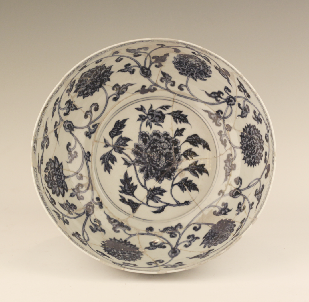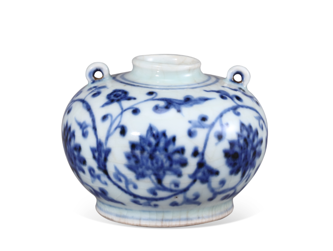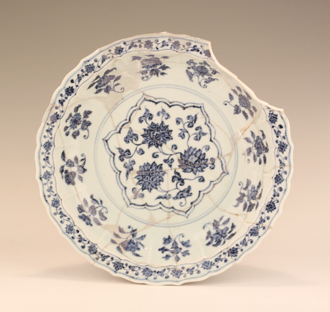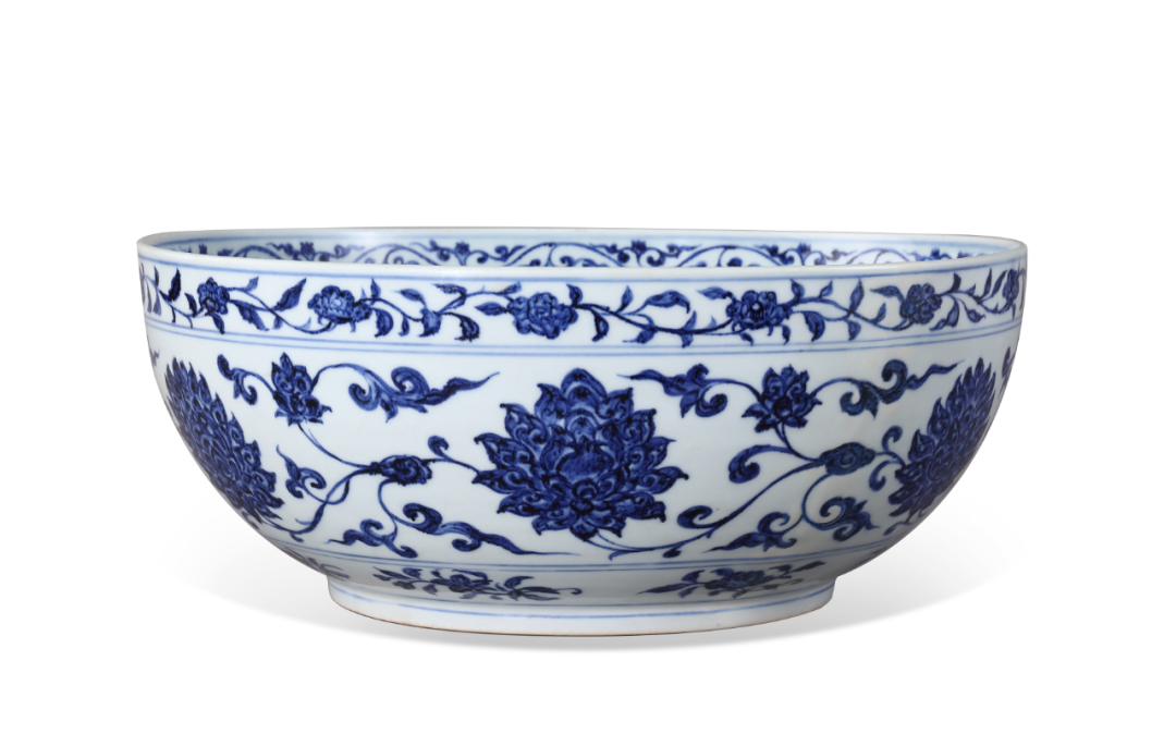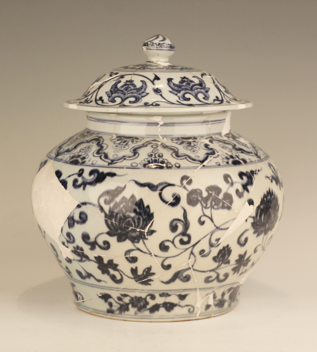 元明之际青花瓷器在原料、技术、纹饰等各个方面,受到中亚、波斯地区釉下彩陶的的影响,与伊斯兰文化有着密切的联系,“明人对于瓷业,无论在意匠上、形式上,其技术均渐臻至完成之顶点。而永乐已降,因波斯、阿拉伯艺术之东渐,与我国原有之艺术融合,于瓷业上,更发生一种异样之精彩。”(吴仁敬,辛安潮。《中国陶瓷史》,商务印书馆,1936)产自中亚的“苏麻离青”钴料飘洋过海运抵景德镇,最终在中国工匠的毛笔下描绘而成的,既有布局繁密、充满伊斯兰风情的“回回花”图案,也有疏朗有致、蕴含笔墨趣味的花鸟异兽。“高铁低锰”的进口青料给瓷绘带来了不小的挑战,若纯用苏料,发色固然深沉紫妍,但因青料淘洗研磨后仍含有氧化铁微粒的问题,绘制的纤细线条中常有黑色的小点,落笔重处则会使铁元素聚集,形成黑斑;而“低铁高锰”的国产青料在绘制时,发色虽呈灰蓝,但呈色稳定。故实际绘制时,工匠常将进口料与国产料搭配使用。