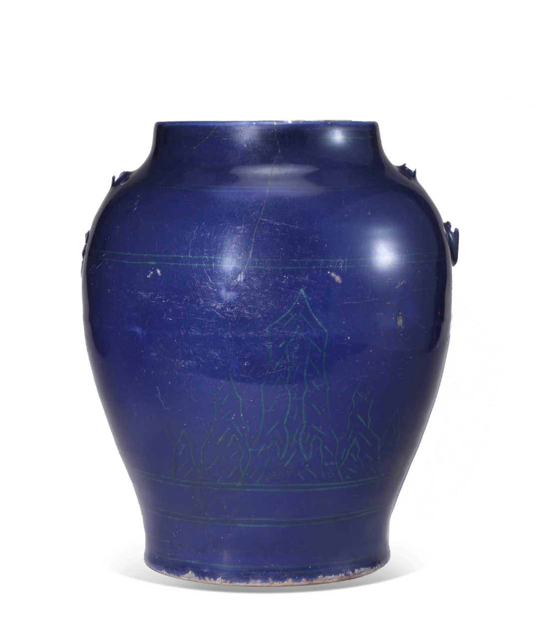 与青花瓷所用钴料一样,通体施钴青釉料在适当温度和气氛下可烧出深浅不同的各色蓝釉瓷器。元代霁青釉(霁蓝釉)施釉极为凝厚,这种与天空一样深邃的高温蓝釉给人以空阔、辽远、超凡脱俗的精神体验,亦为以进口钴青料烧制的高温颜色釉瓷器。